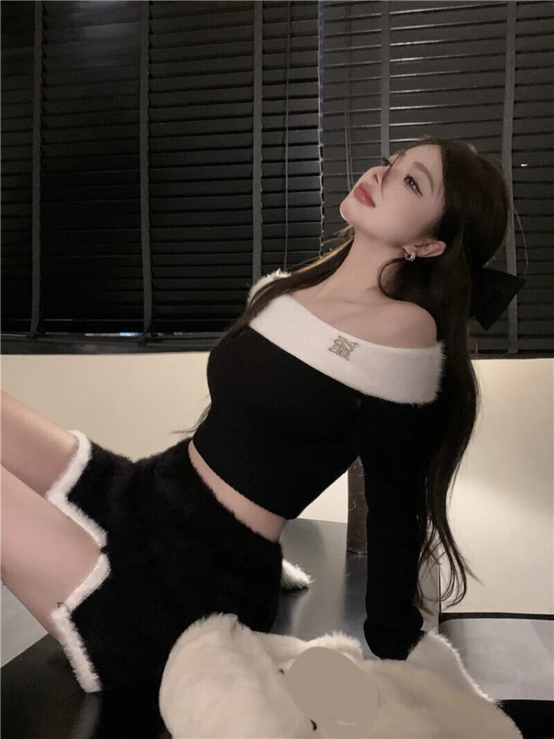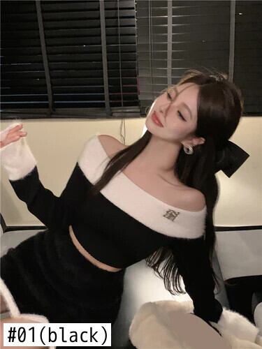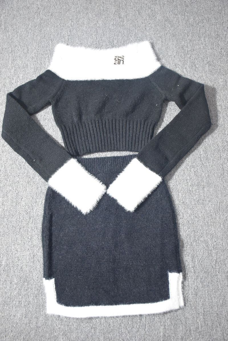 セクシーなワンショルダー秋冬ホットガールアメリカンスーツ長袖ニットウエストスリムラップヒップショートスカートツーピースセット ロング オータム 秋物 ウィンター 冬物 got85422513055
