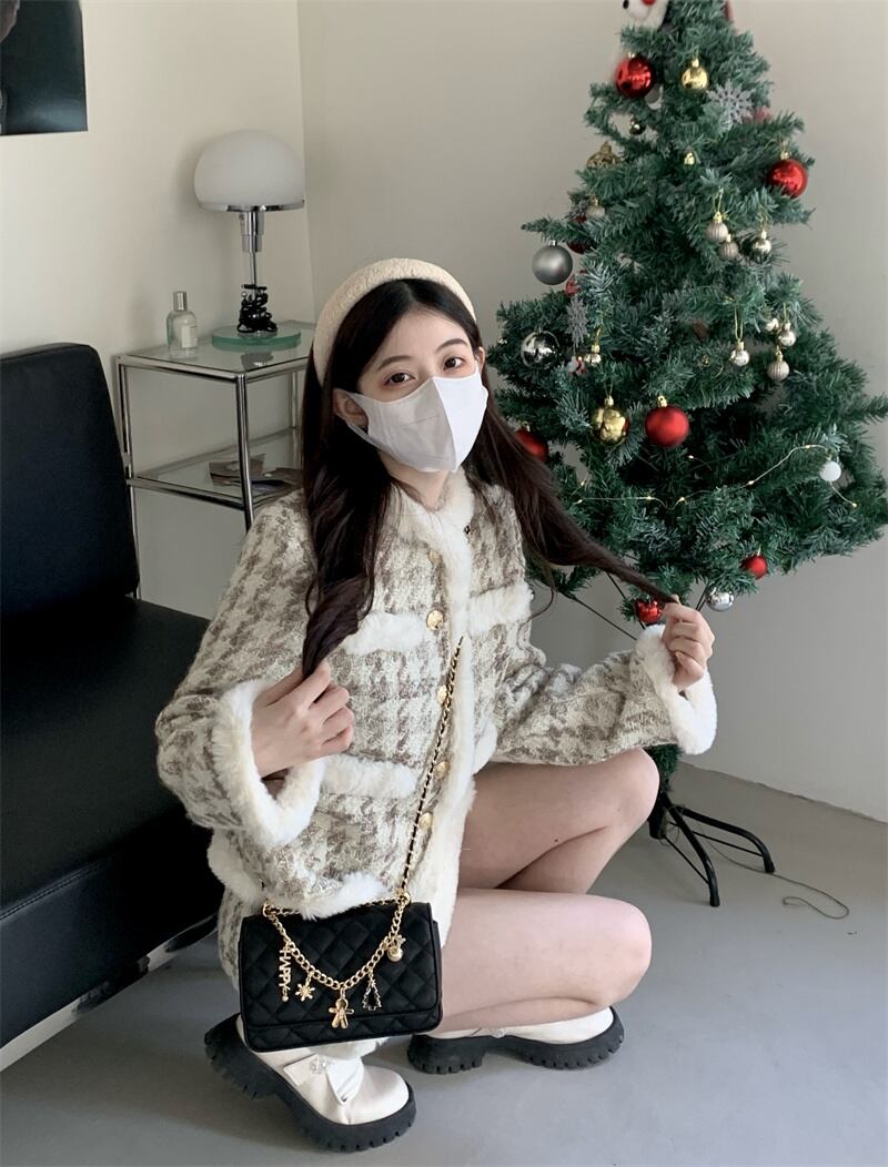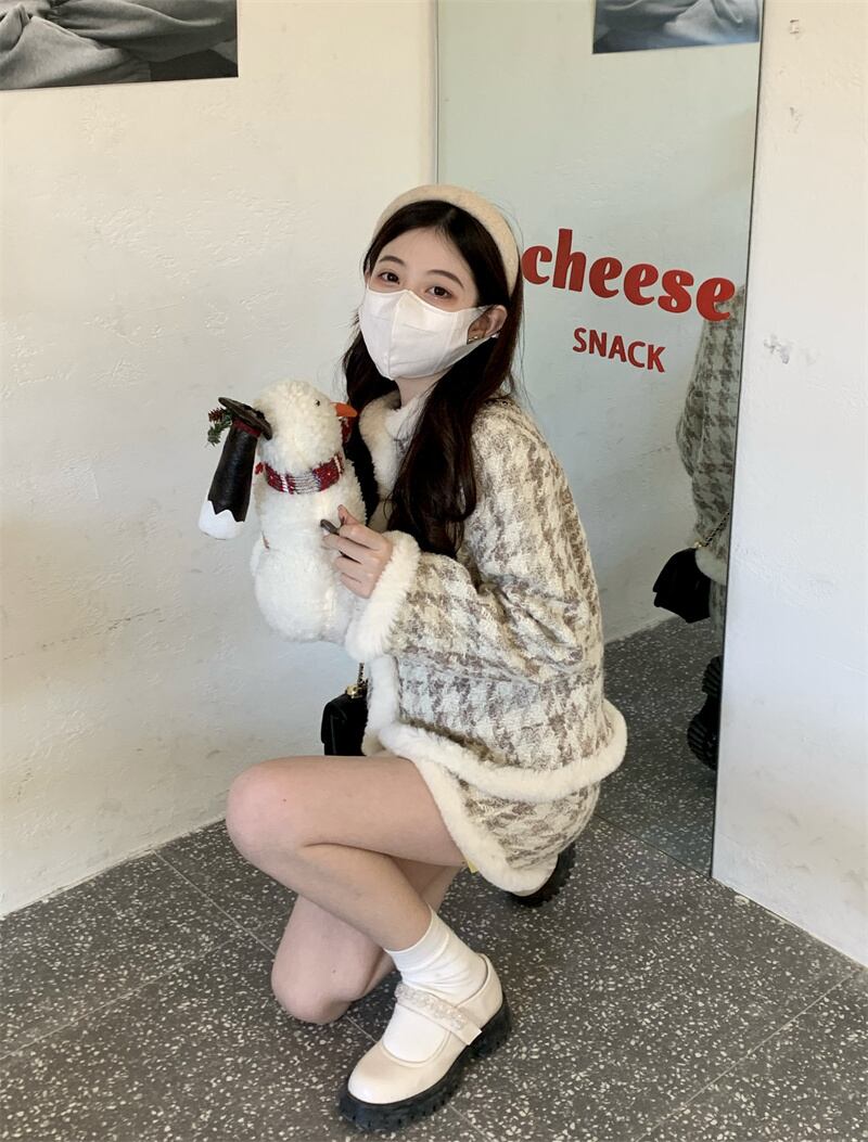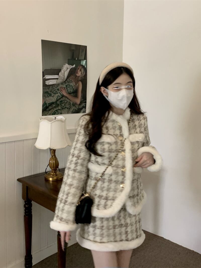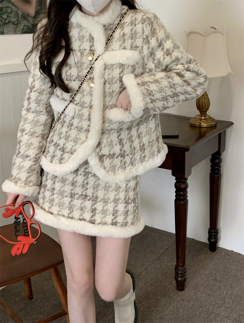 千鳥格子の豪華なスーツの女性の長袖カーディガンコートトップ冬ウエストスカート 2 点セット服 ロング ウィンター 冬物 got31257613839