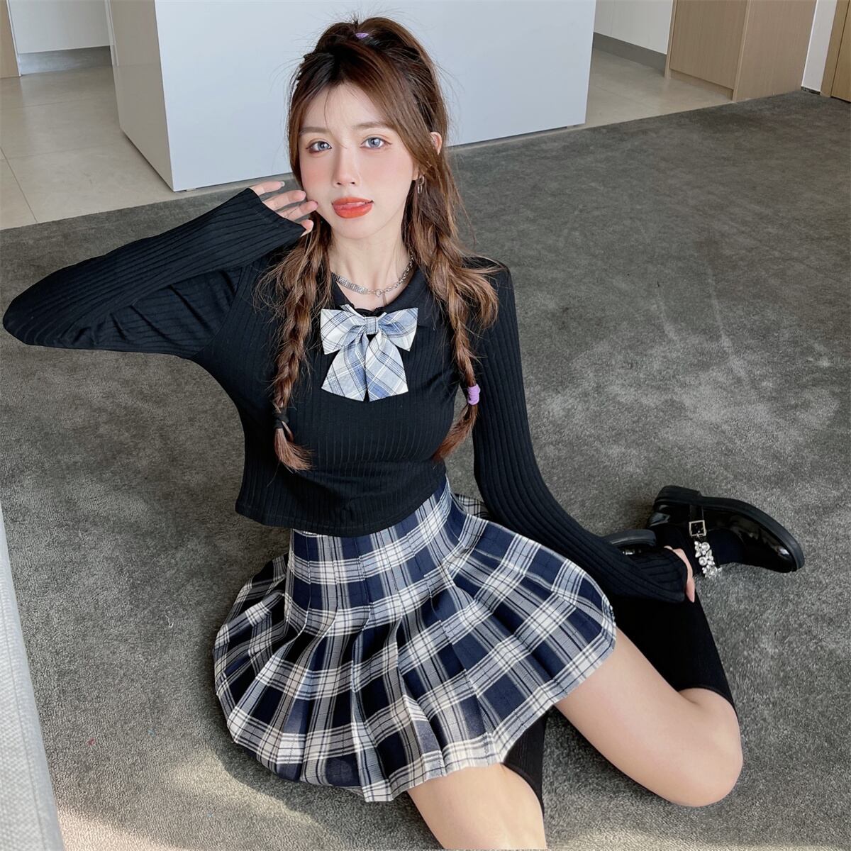 甘くてホットガールスーツのポロ襟弓長袖トップウエスト JK チェック柄スカート 2 点セット服 ロング リボン 大人ガーリー スウィート キュート カジュアル