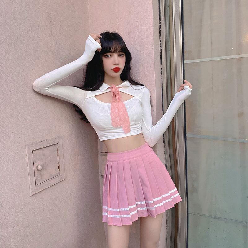 Gothiscyn セクシーなスーツ白 Tシャツ中空アウトクロップトップスカート 2 個セットスーツスキニーシック Y2k オフィスレディ春 ホワイト スプリング 春物 会社 学校 通勤や通学にも