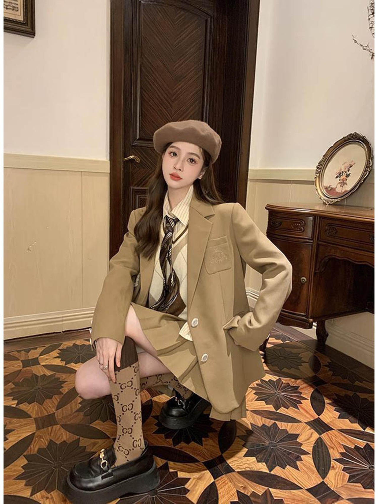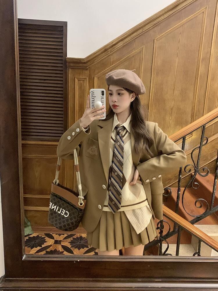 4 点セット レディース衣装甘いスーツ ジャケット長袖シャツ ニット ベスト プリーツ スカート梨花服スカート セット ロング 大人ガーリー スウィート キュート カジュアル ソリッドカラー