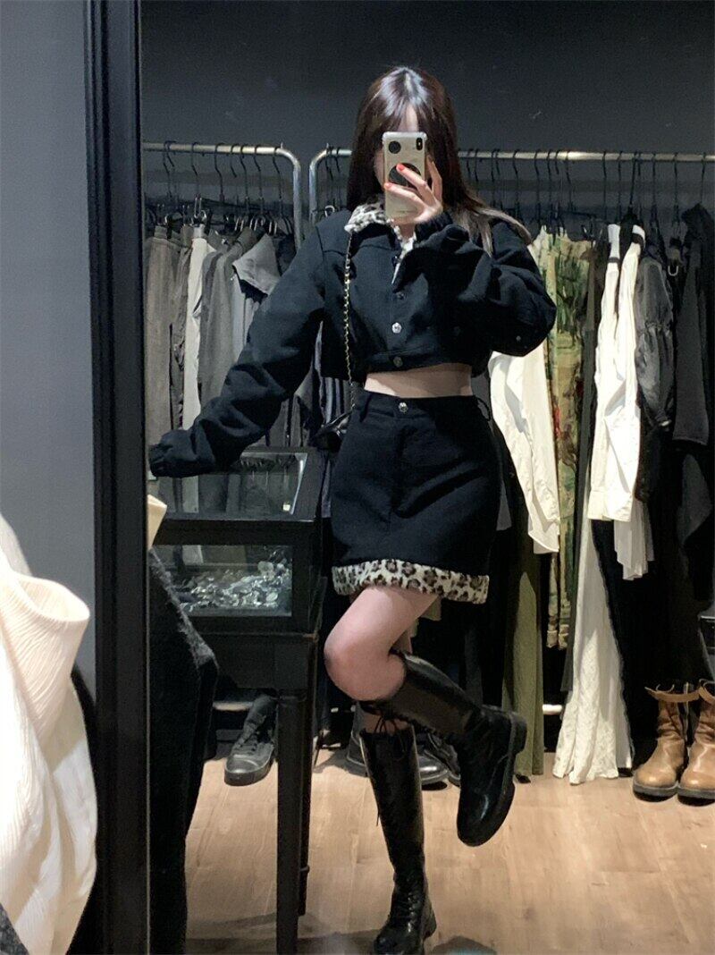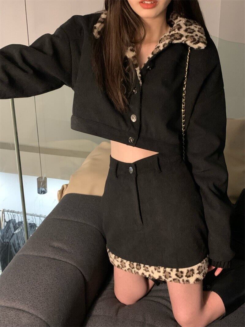 ホットガールスーツのゆったり長袖ショートヒョウコート冬ウエストショートスカートツーピースセット服 ロング ウィンター 冬物