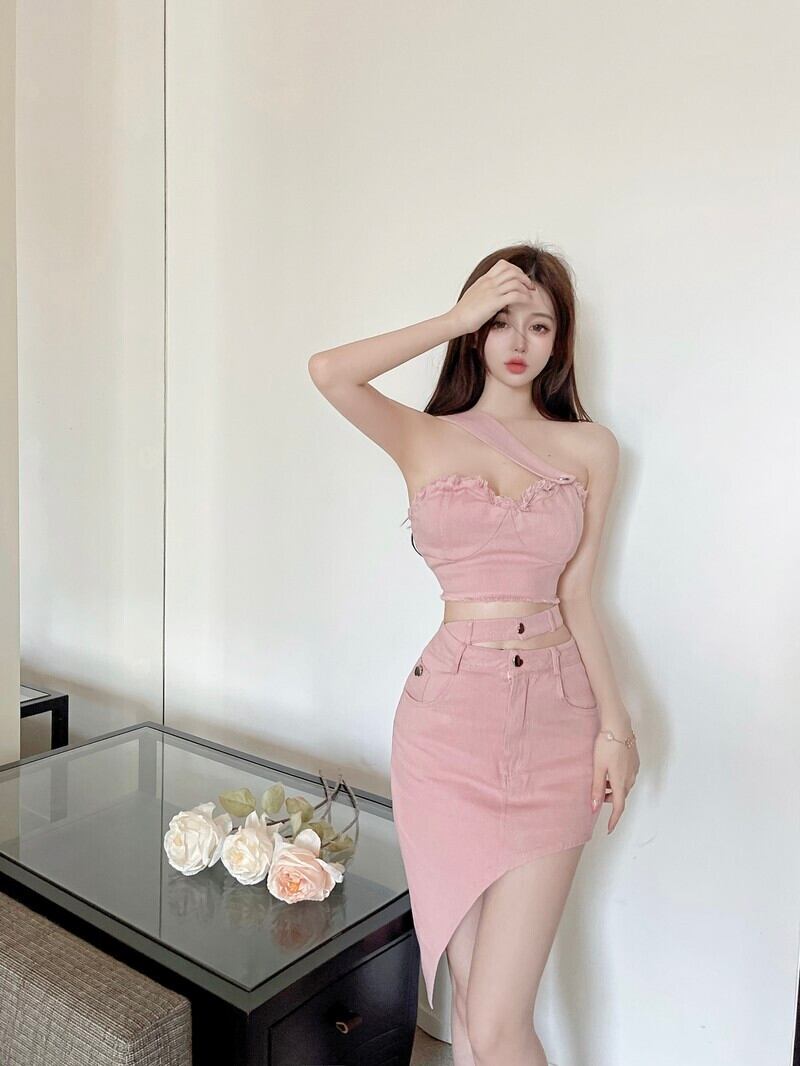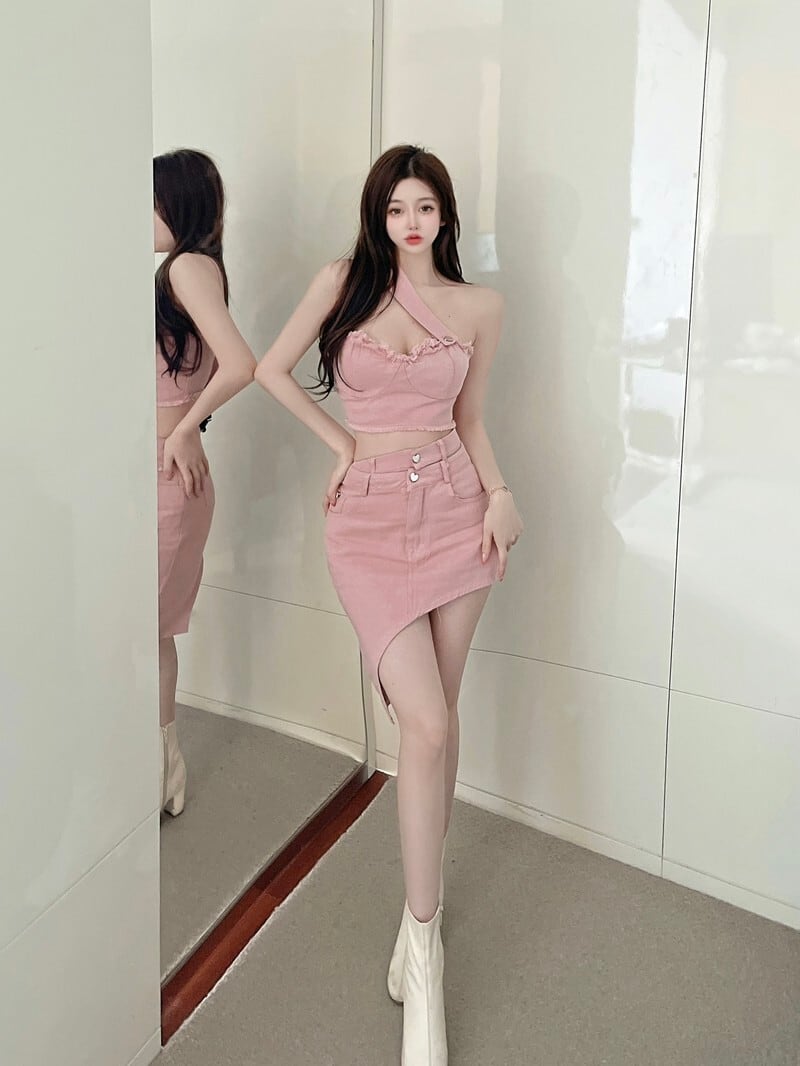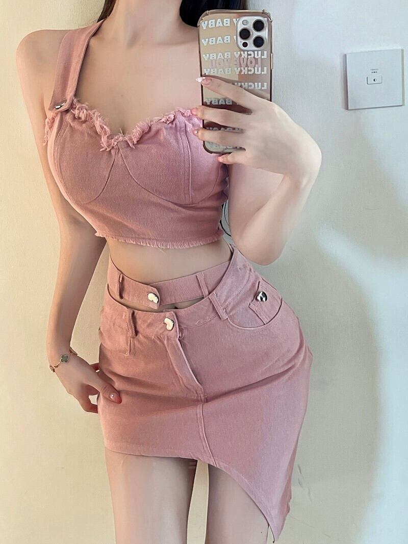 ホットガールピンクスーツ不規則なウエストスカートのユニークな甘いレトロなデニムスリング 2 点セットセクシーな服 大人ガーリー スウィート キュート カジュアル