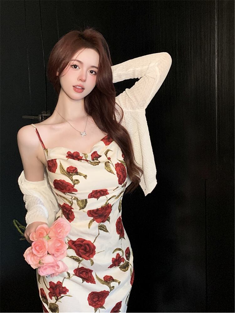 Gothiscyn フレンチフローラルローズドレス夏レトロ気質セクシーなスリムサスペンダースカートスーツ甘いセクシーなスラッシュネック Vestidos 大人ガーリー スウィート キュート カジュアル サマー 夏物 花柄