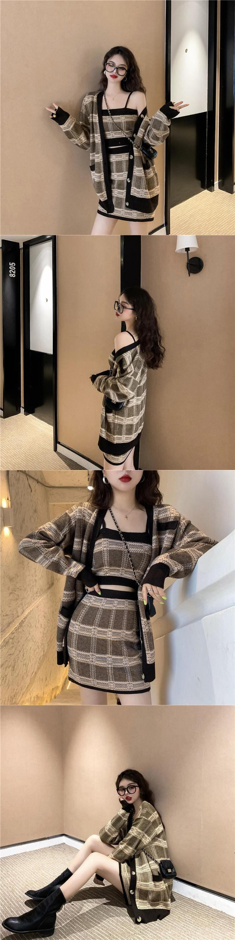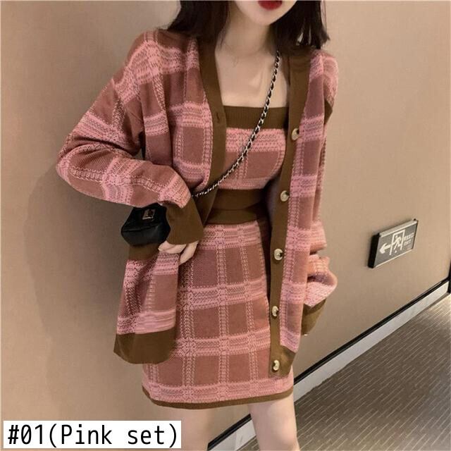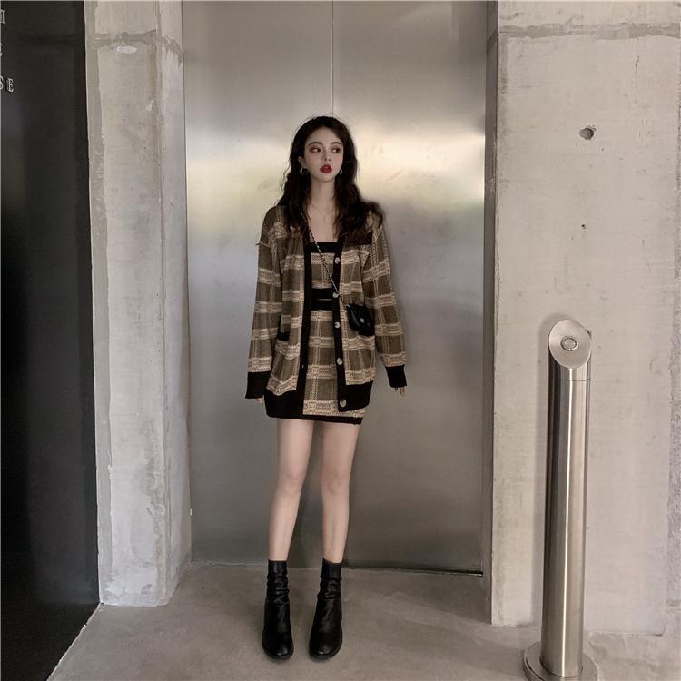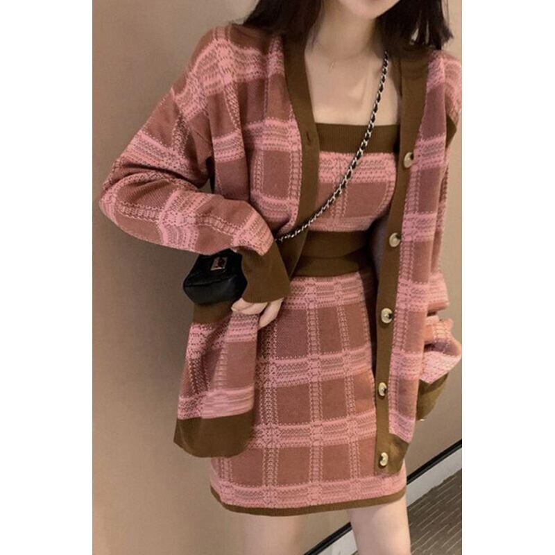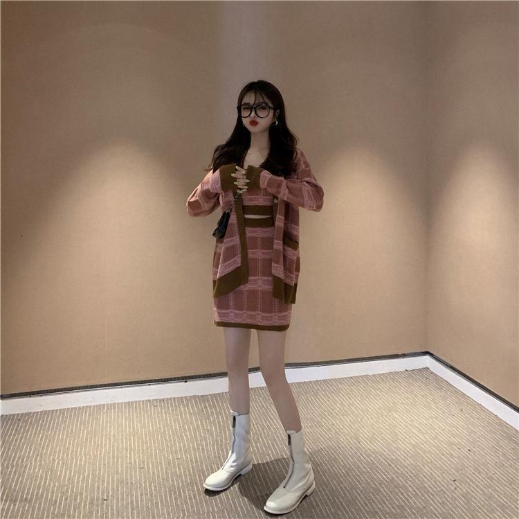 ニットスーツ レディース チェック柄 長袖 Vネック カーディガン キャミソール ウエストヒップラップスカート 3点セット ロング