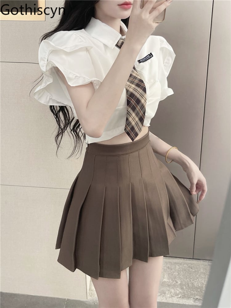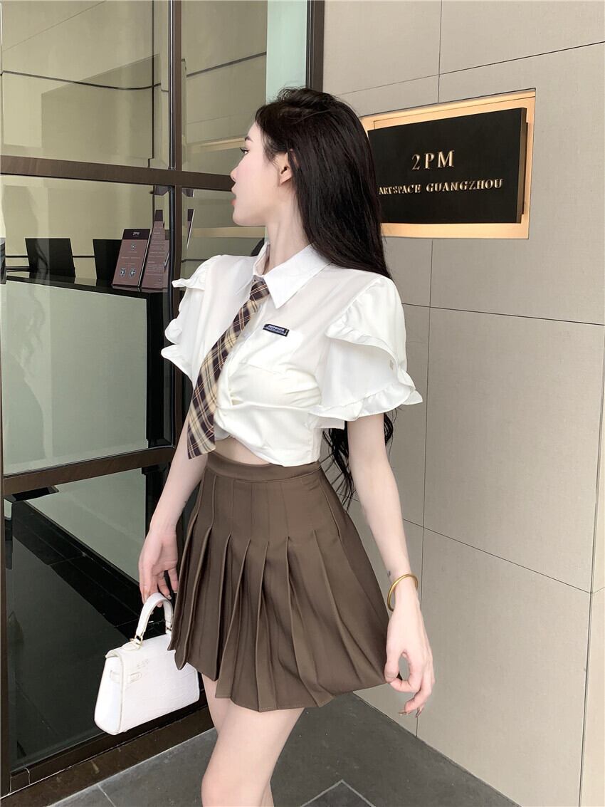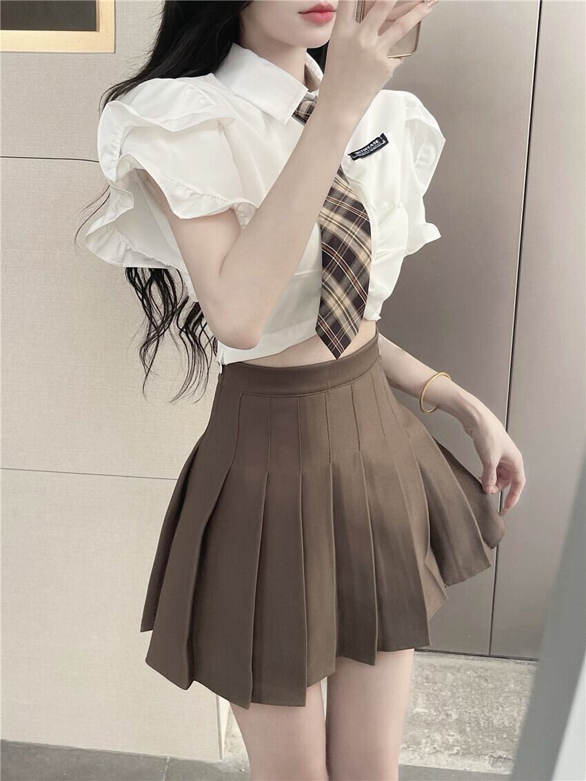 Gothiscyn 夏 JK スウィートプレッピー花びらスリーブシャツトッププリーツショートスカートホットガールツーピーススーツ 大人ガーリー キュート カジュアル サマー 夏物