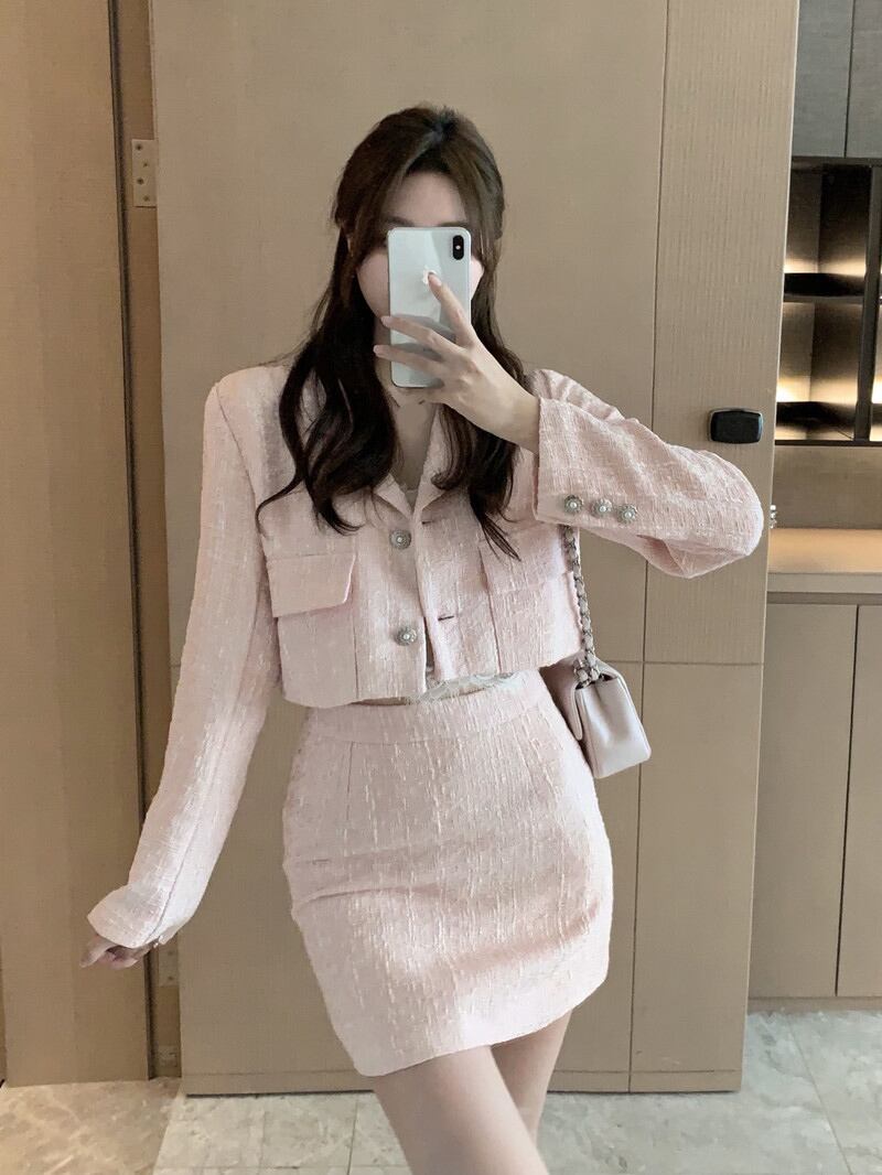 OL 春秋スーツ レディース ツイード 長袖 ショートコート ウエストスカート 2点セット 洋服 ロング スプリング 春物 オータム 秋物 会社 学校 通勤や通学にも
