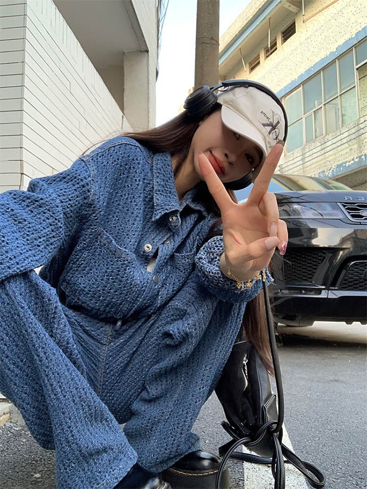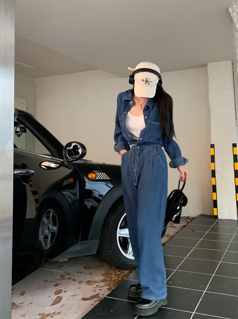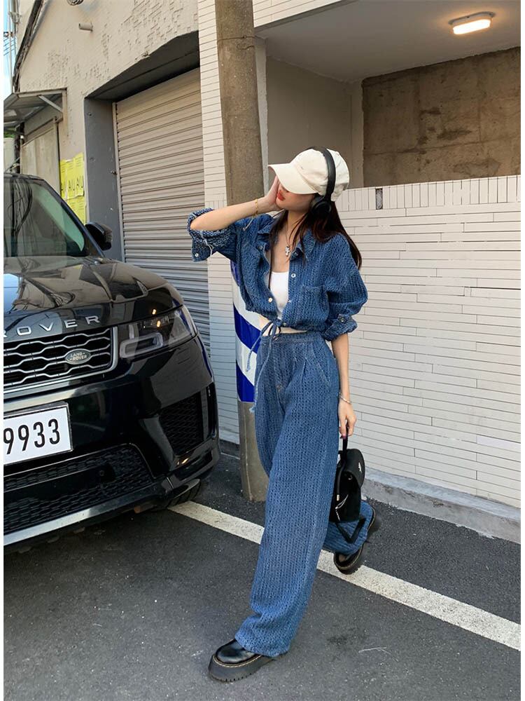 勒レディースツーピースセット無地ジーンズスーツショートロングスリーブトップデニムワイドレッグパンツプレッピースタイル秋セット 長袖 オータム 秋物 ワイドパンツ ソリッドカラー