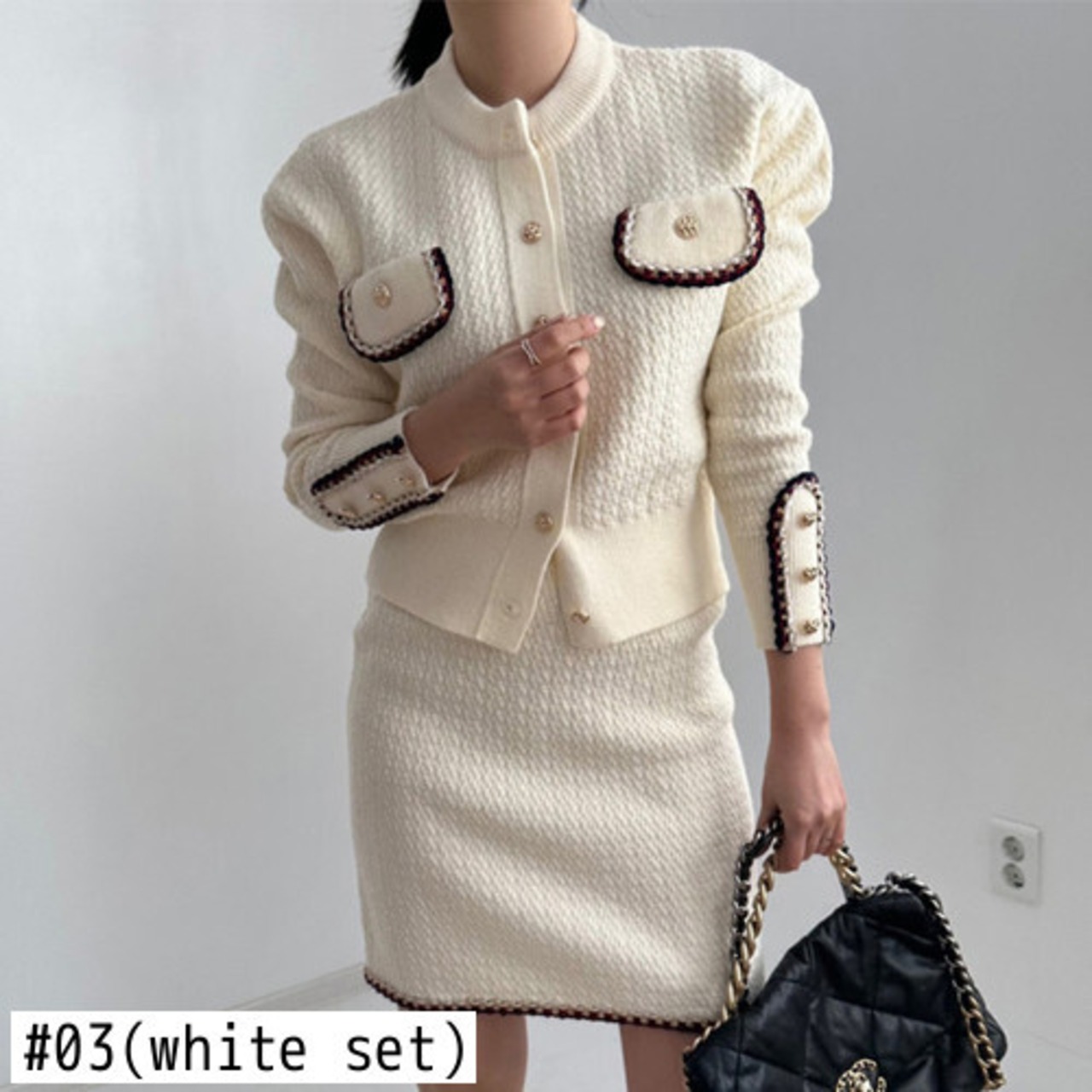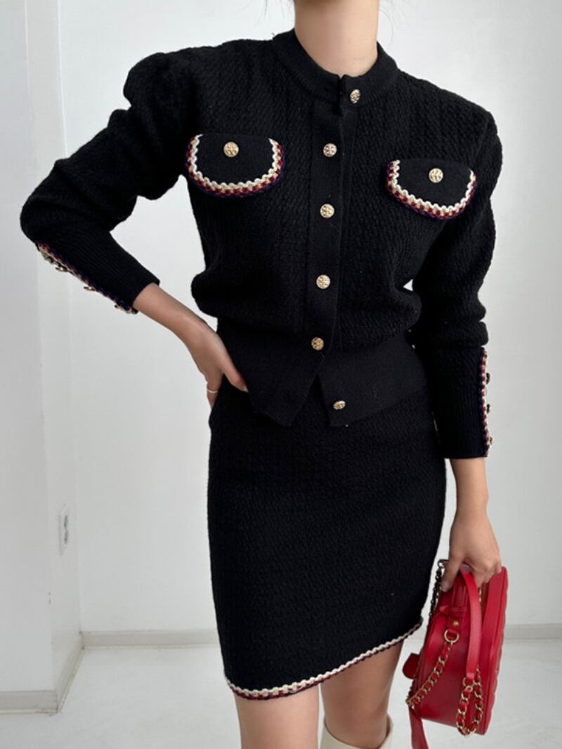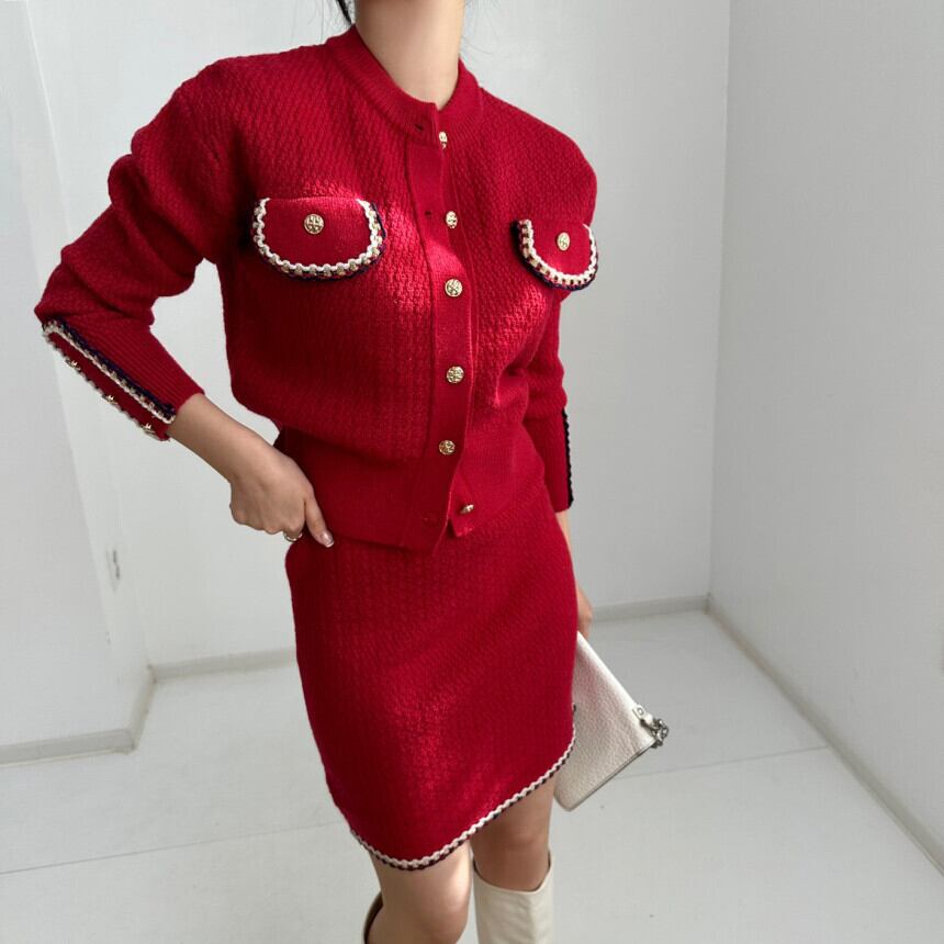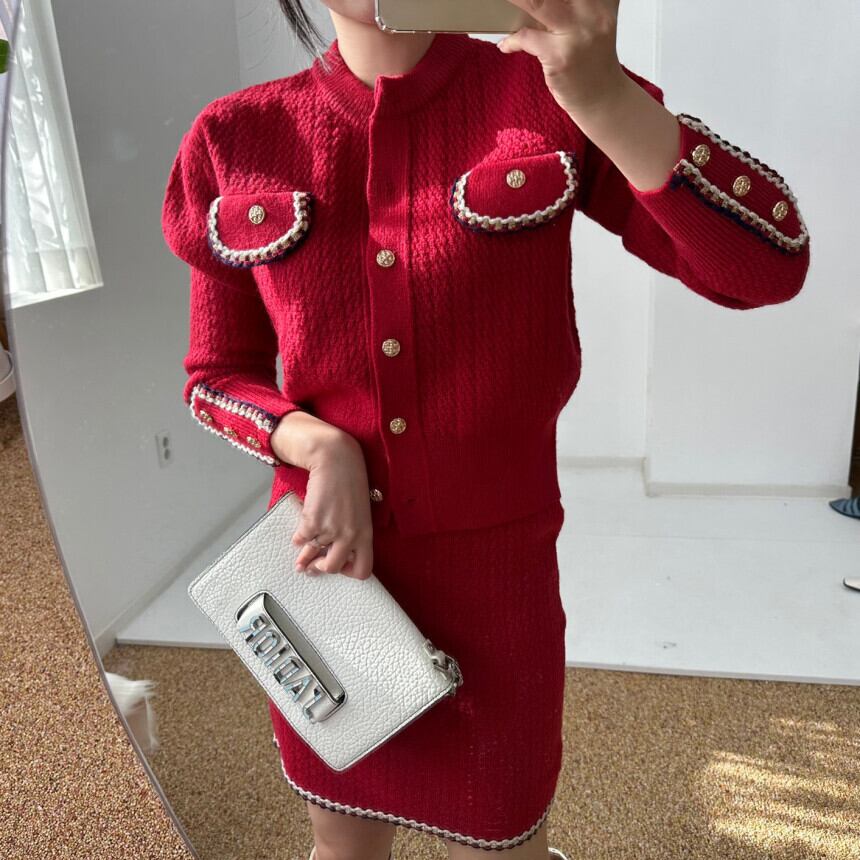 シックなスタイルのスーツののラウンド ネック ニット カーディガン ショート セーター ウエスト スリムお尻スカート 2 点セット