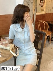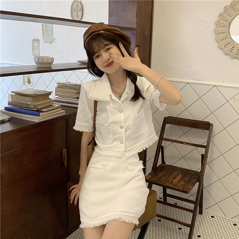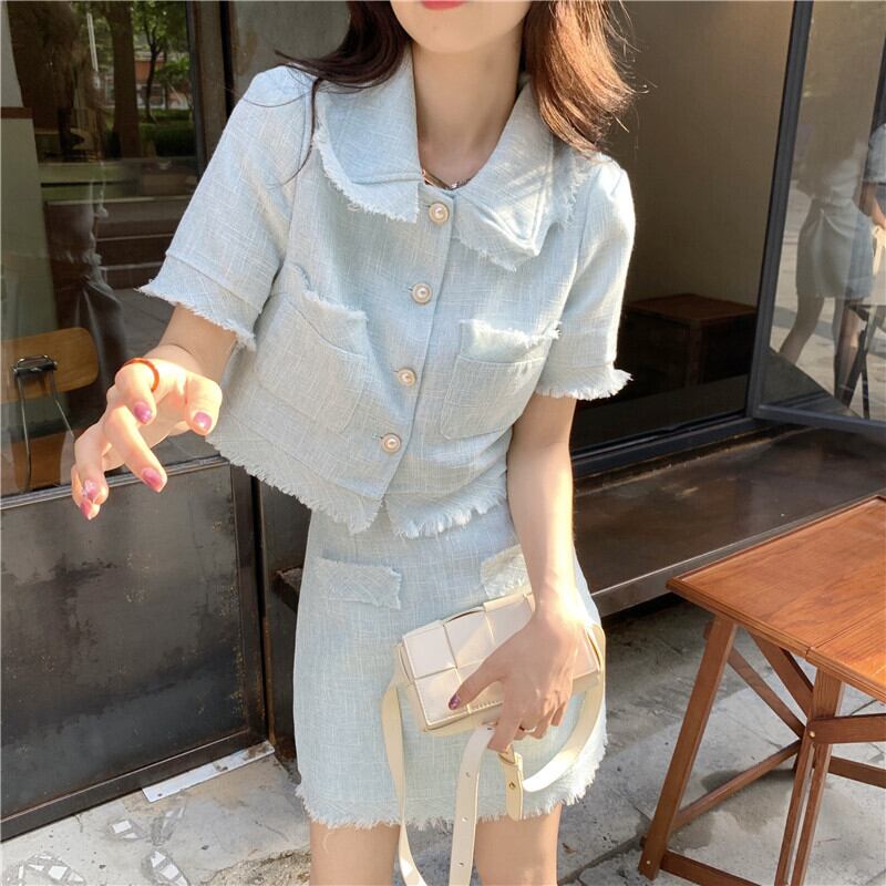 Gothiscyn レディース スーツ オフィス ブルー スーツ ローエッジ 2点セット シックスーツ 夏 ショート トップス スカート サマー 夏物 会社 学校 通勤や通学にも