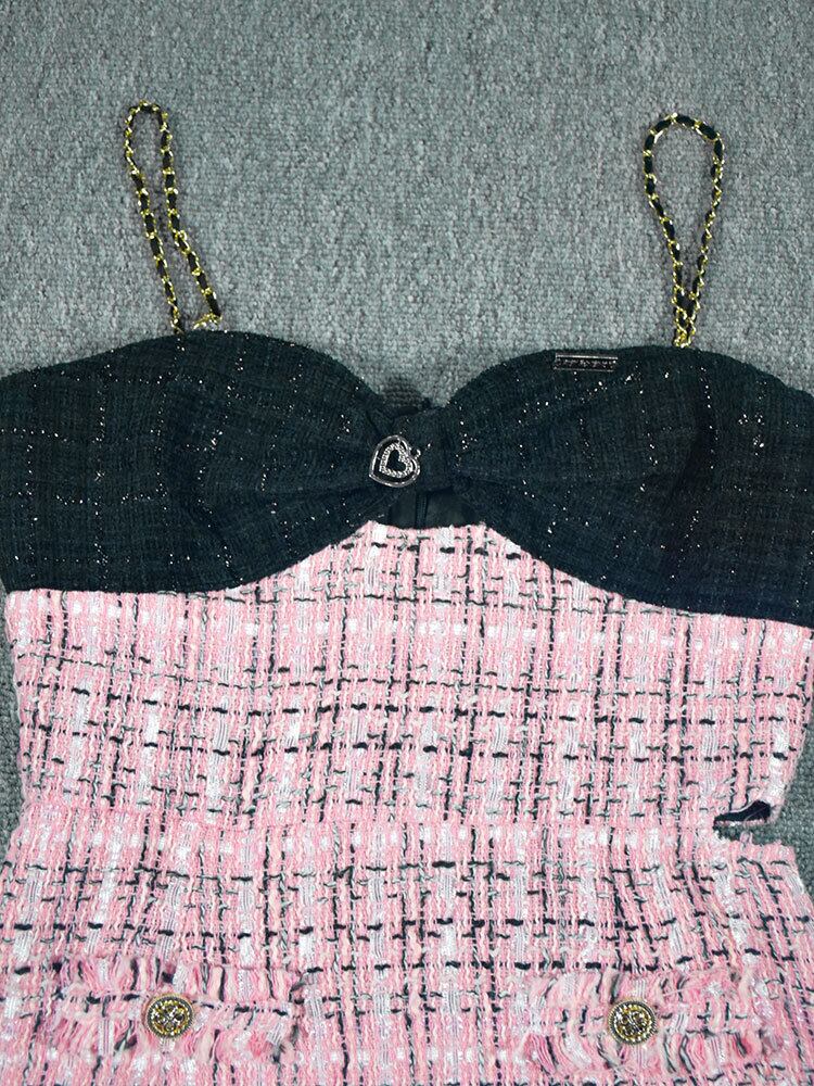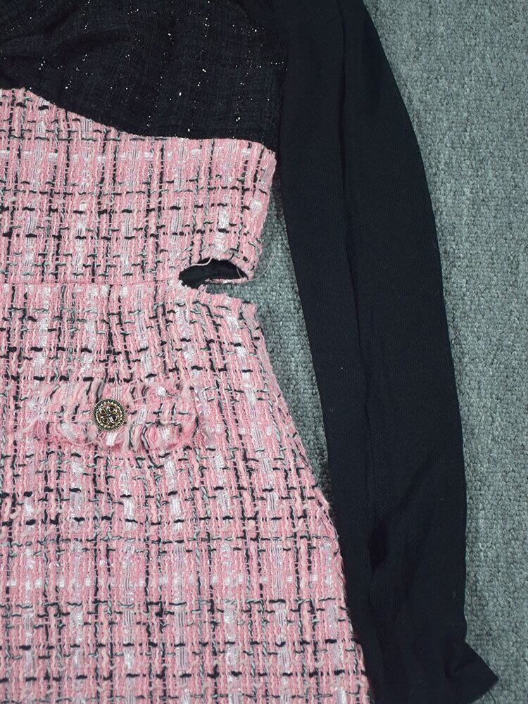 チェック柄ツーピースドレスレトロ小さな香りステッチドレススリム中空長袖カーディガンの夏のスーツ ロング サマー 夏物