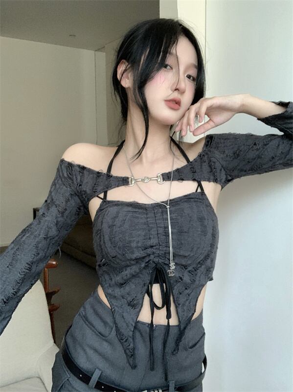 香港スタイルのスーツのの春ホット女の子長袖ショート ブラウス ホルター サスペンダー ベスト 2 点セット ロング スプリング 春物