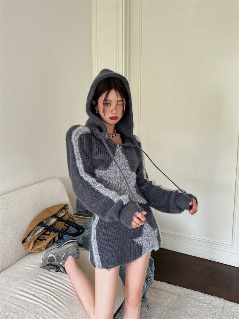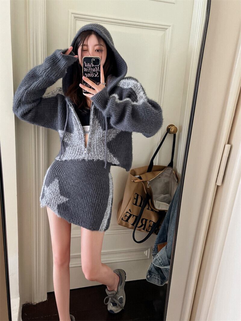 ツーピーススーツ長袖フード付きジッパーニットカーディガンショートセーターコートウエストスカートできる服 ロング