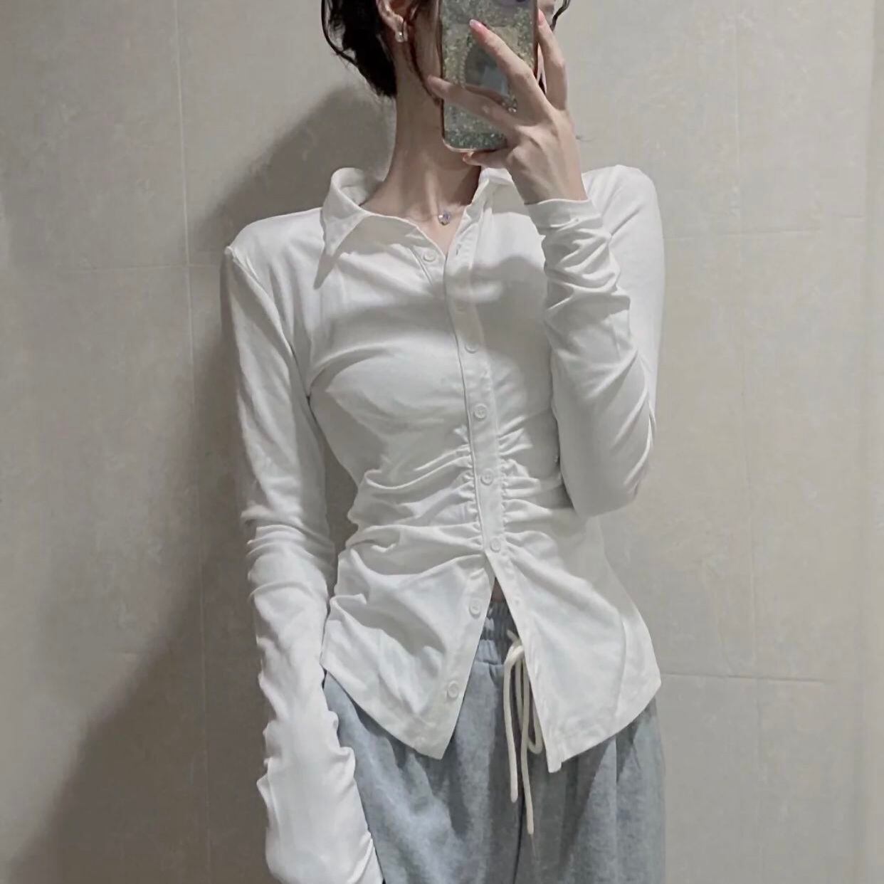 セクシーなシャツ スキニー グレー Y2k 長袖 プリーツ シックな ストリートウェア アウターウェア レイヤートップ オフィスレディ ブラウス ロング 会社 学校 通勤や通学にも