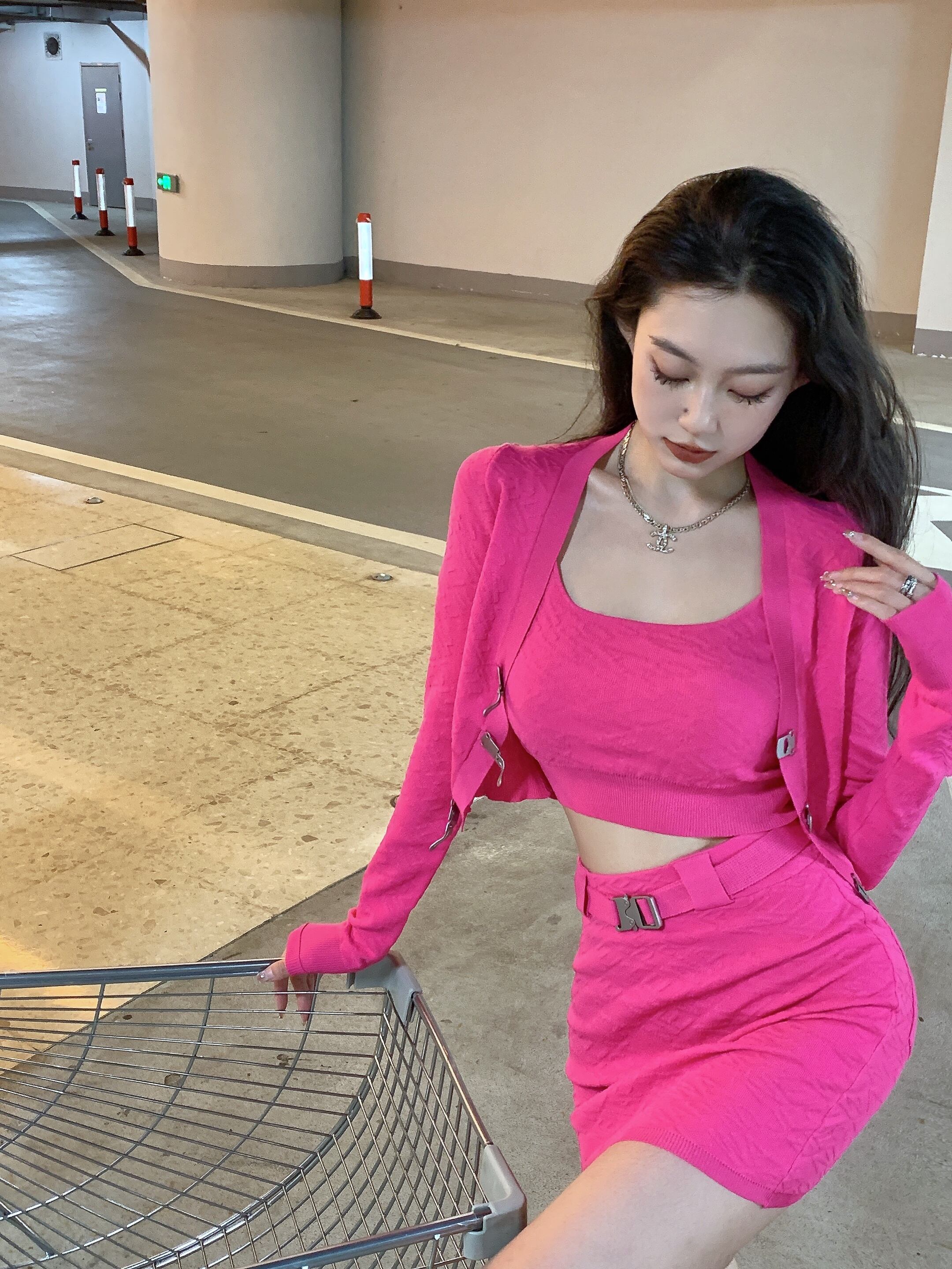 春夏スーツレディースシックニットカーディガントップセクシーサスペンダーウエストスリムスカート3点セット スプリング 春物 サマー 夏物