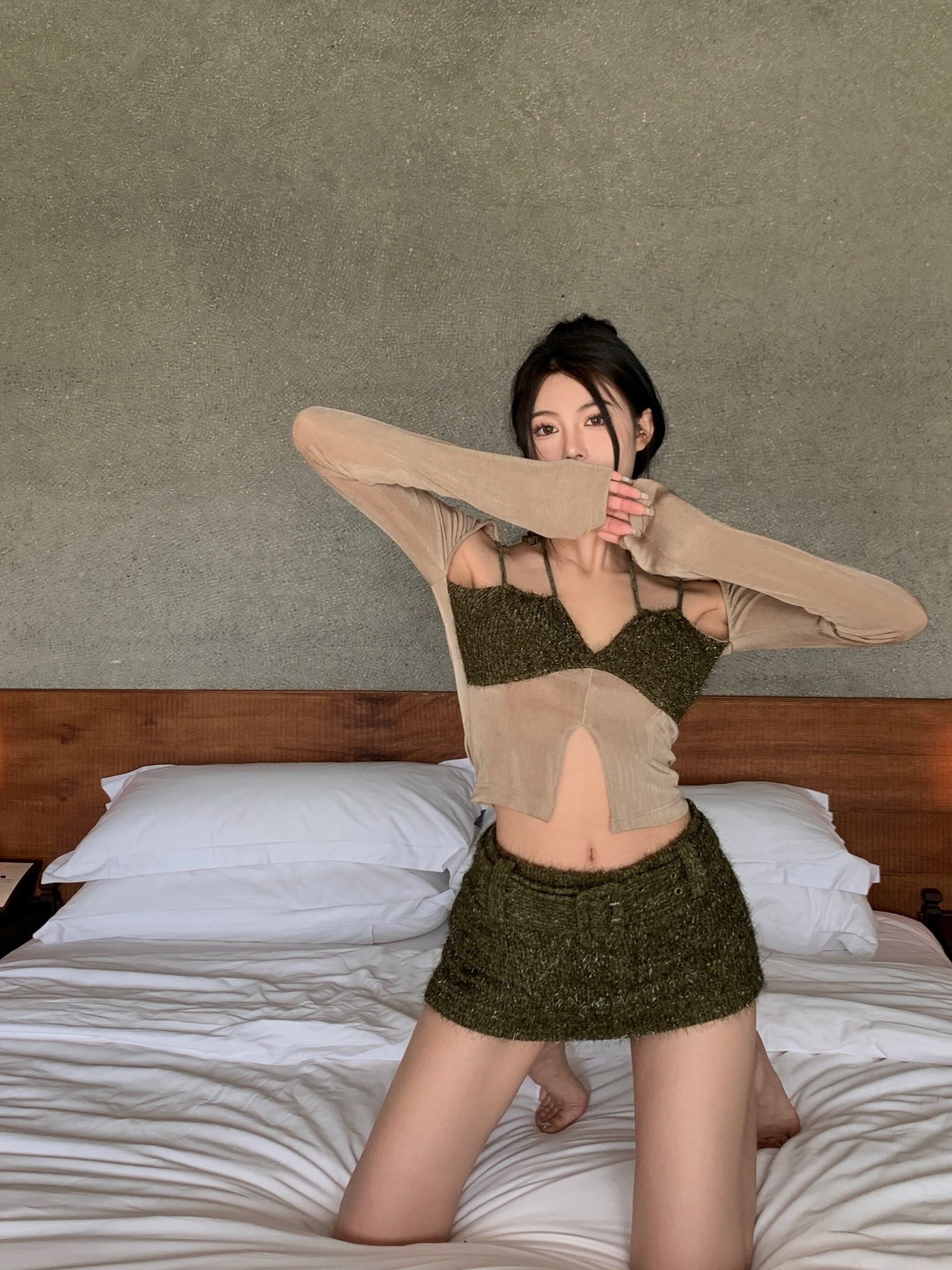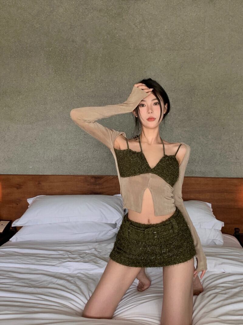 ホットガールズスーツの長袖ホルターネックニットトップローウエストスリムセクシーなミニスカートツーピースセット服 ロング