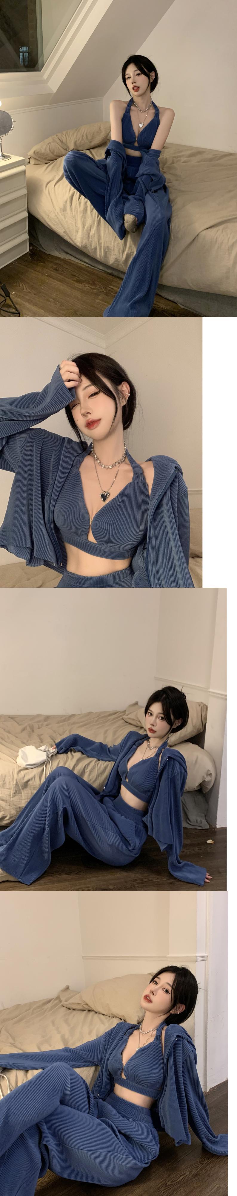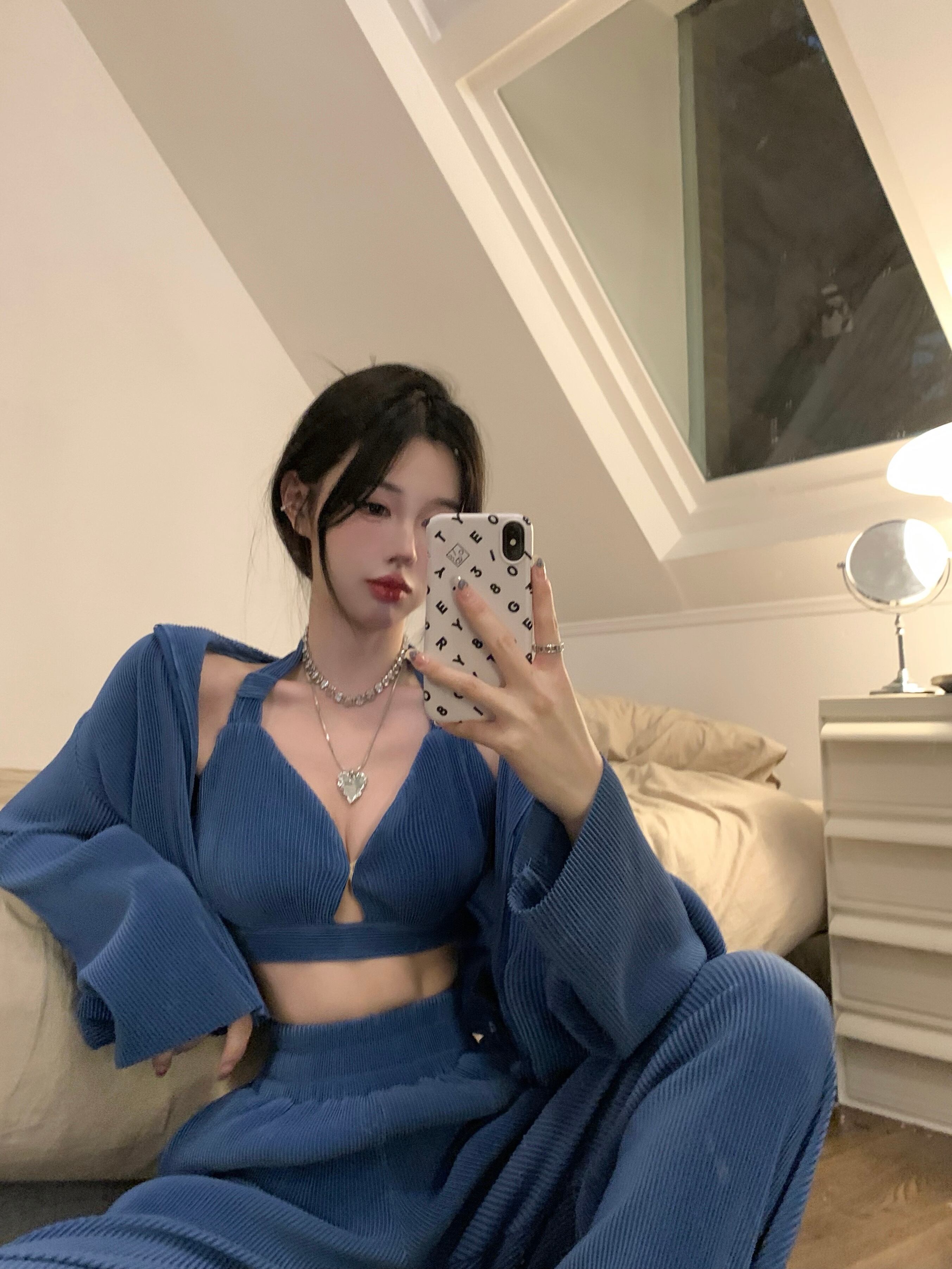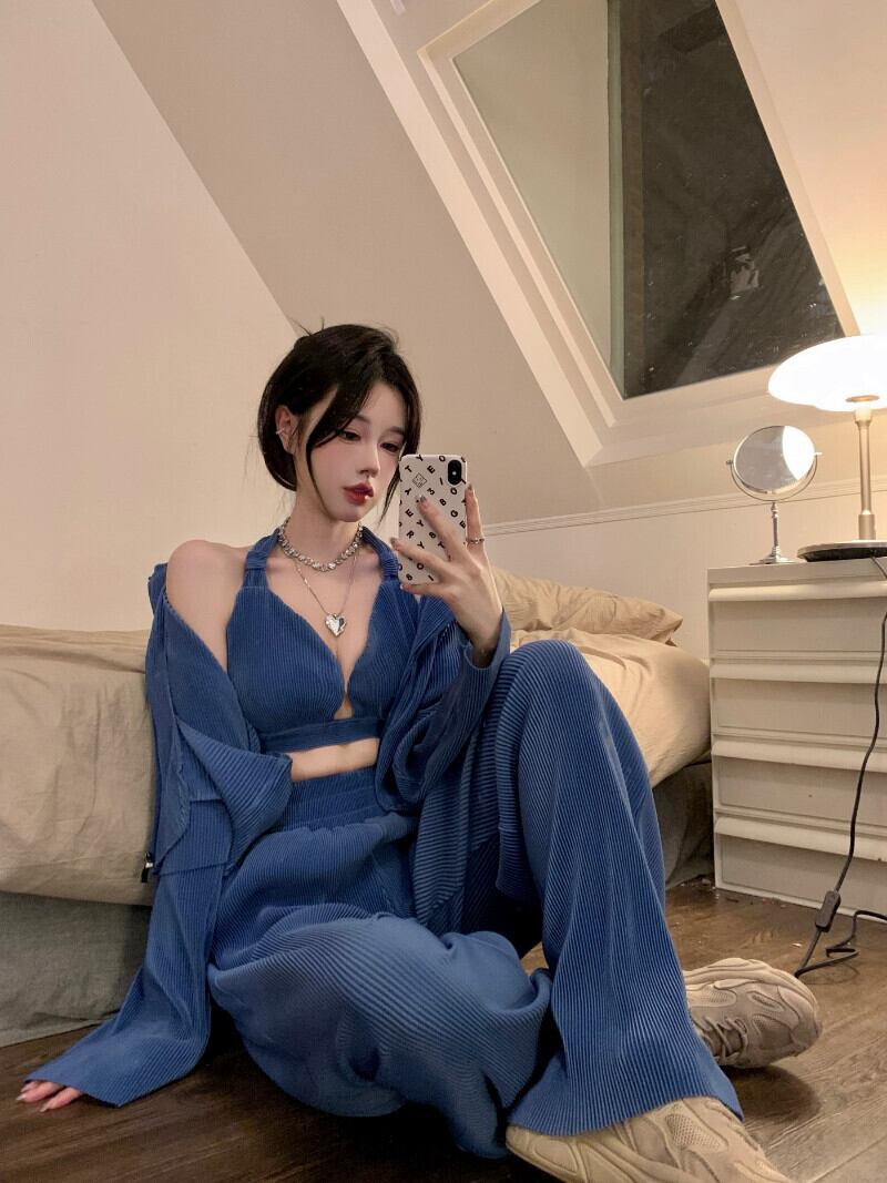 春スタイルのスーツのの香港ホットガールスリングシャツフード付きショートコート弾性ウエストワイドレッグパンツ 3 点セット エラスティック 伸縮 スプリング 春物 ワイドパンツ