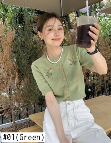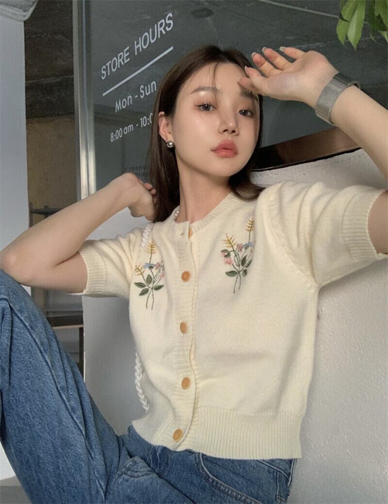 夏のニットカーディガン刺繍ニットカーディガン上着ショートシックな ese 優しい風半袖トップ レッド ハーフスリーブ サマー 夏物