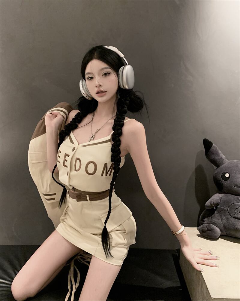 Gothiscyn スリーピースセットレディース衣装甘いレトロな野球ジャケットスリングワークドレス無地梨花服スカートセット 大人ガーリー スウィート キュート カジュアル ソリッドカラー