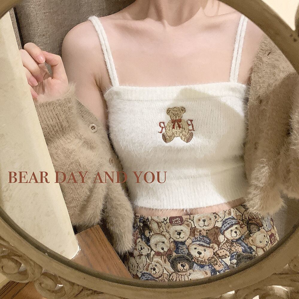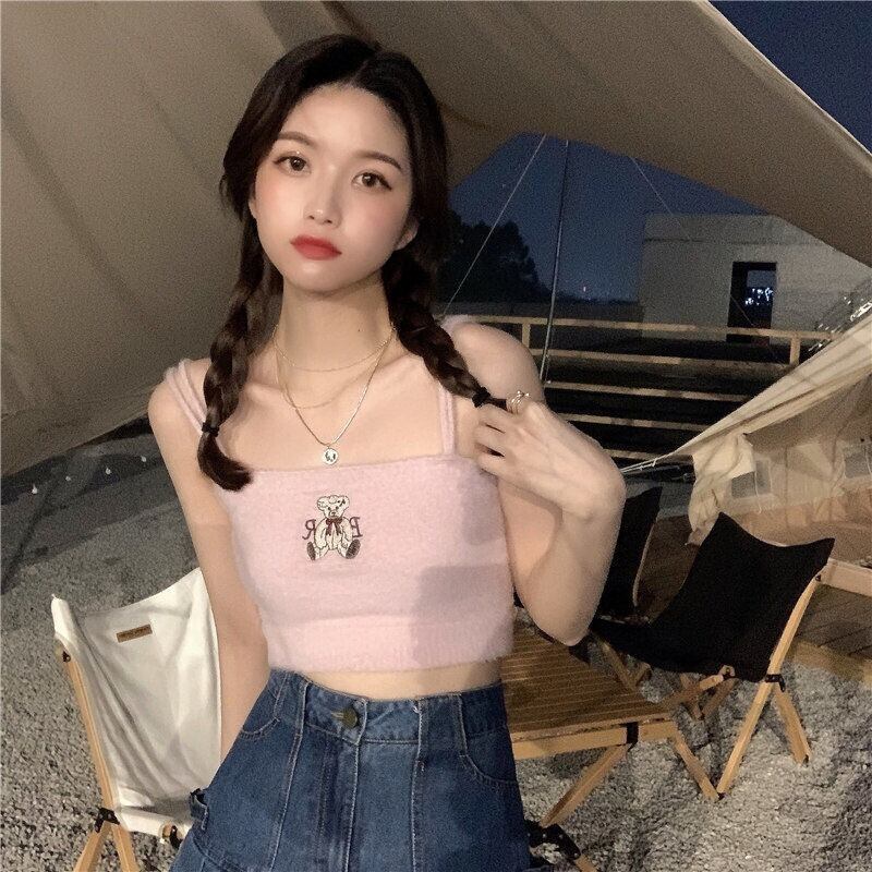 Y2k タンクキャミベア刺繍サスペンダースキニー Kintted クロップトップス服かわいいトップ十代の少女キャミホルター 大人ガーリー スウィート キュート カジュアル