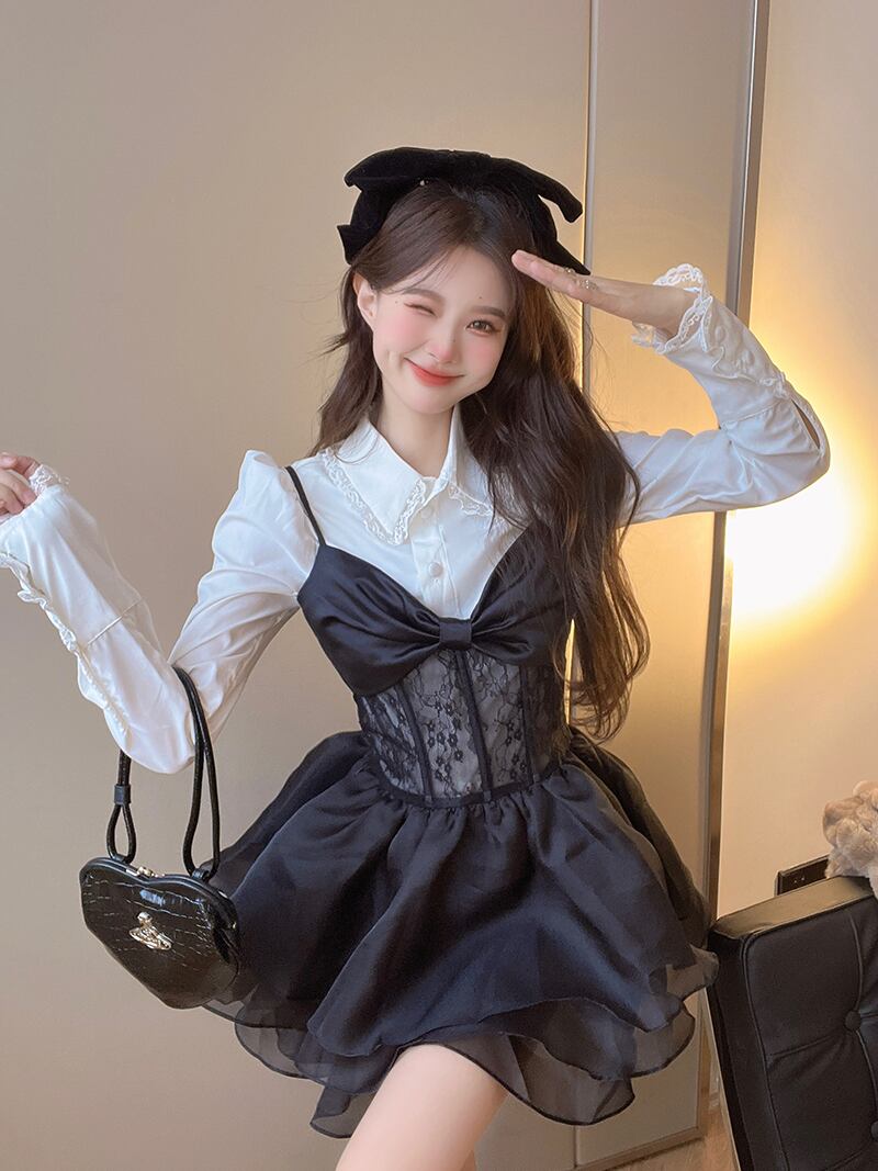 フレンチスイートガールスーツ レディース レース メッシュ Aライン ふんわりサスペンダー ショートドレス 長袖 ターンダウンカラーシャツ 2点セット ロング 大人ガーリー スウィート キュート カジュアル ふわふわ