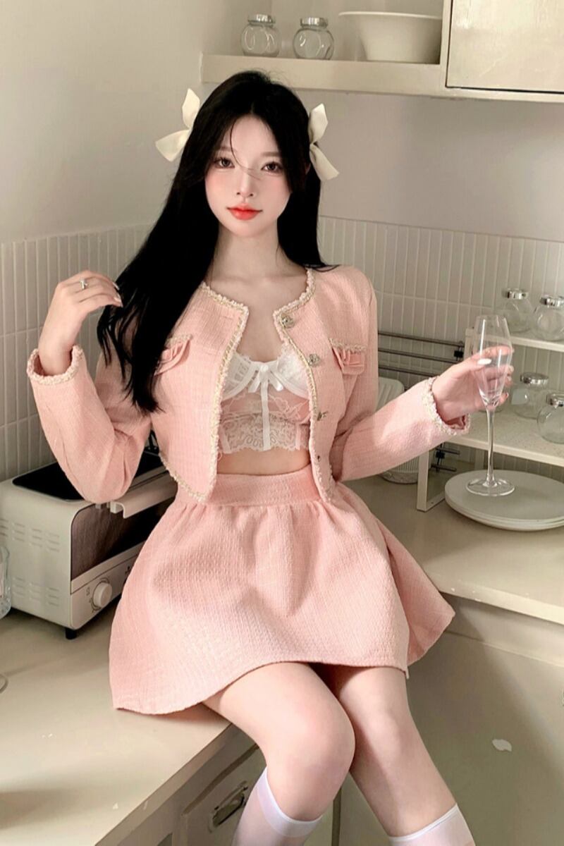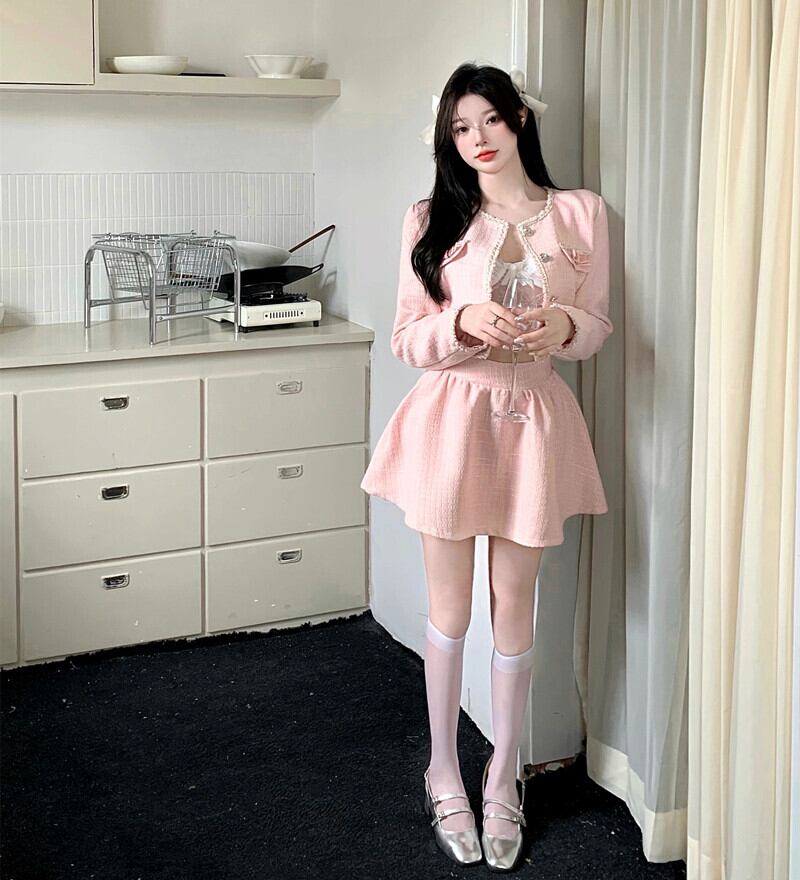 スウィートガールスーツ Cl コートショートカーディガントップの秋のウエストプリーツスカート 2 点セット服 大人ガーリー キュート カジュアル オータム 秋物
