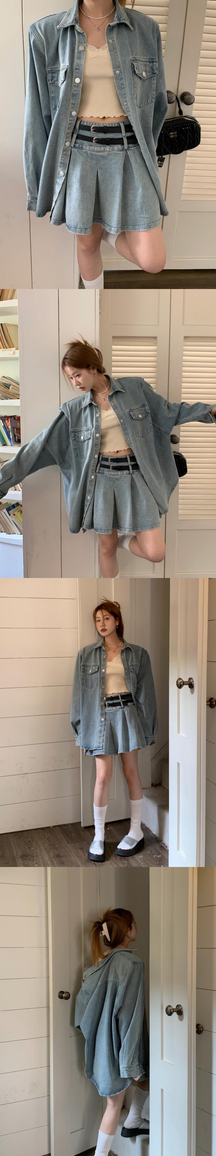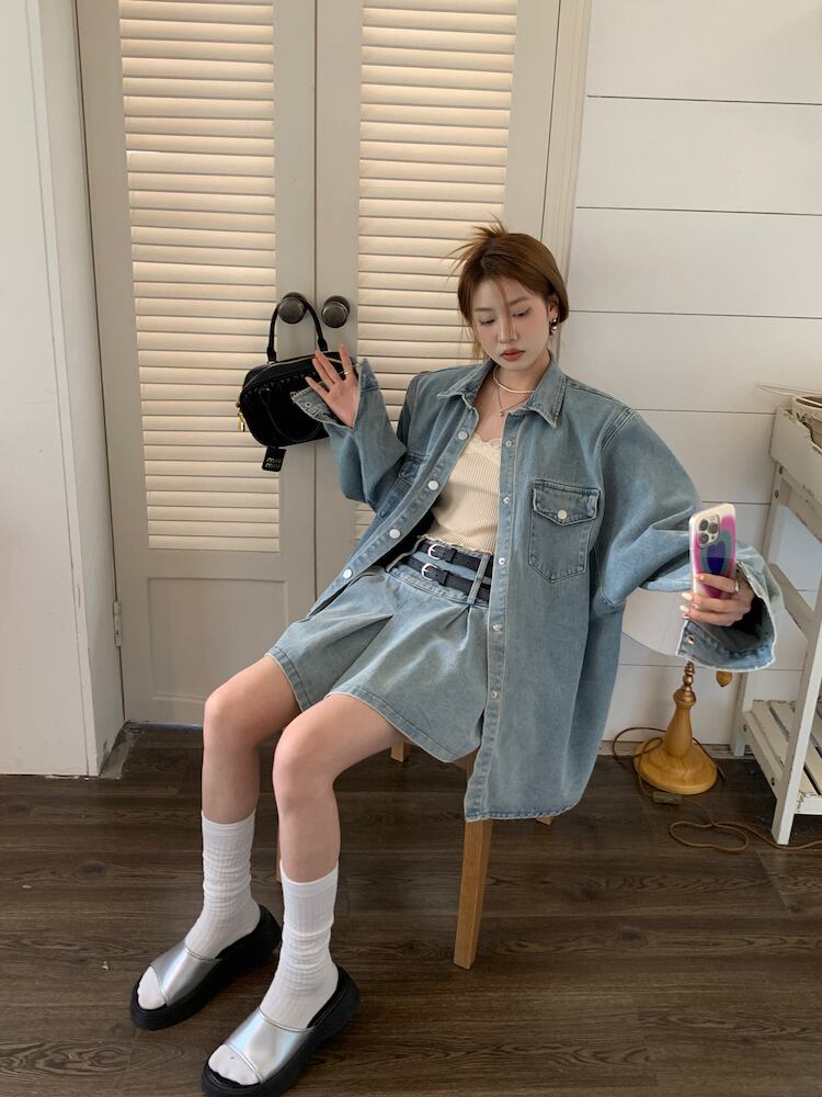 ホットガールスーツのウエスト洗えるデニムスカートターンダウン襟ショルダーパッドコートツーピースセット服