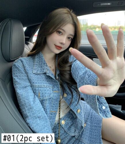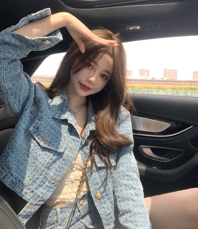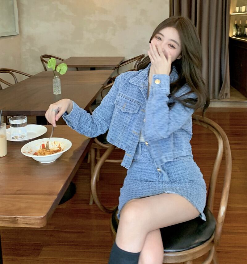 デニムスーツレディースロングスリーブショートコート不規則トップウエストスカートツーピースセットファッション服 長袖