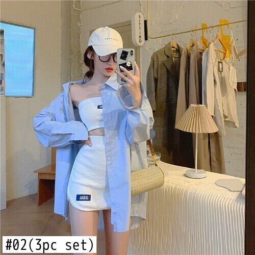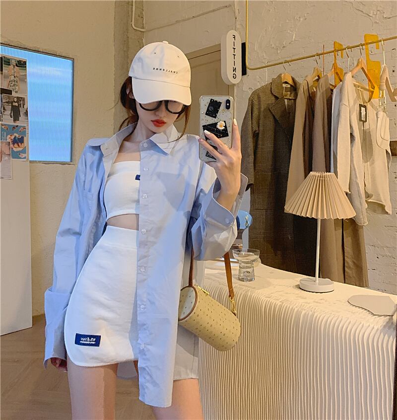 スリーピースセットレディース衣装ミディアムとロングブルーシャツスラッシュネックトップホワイトスカート無地梨花服夏セット サマー 夏物 ソリッドカラー