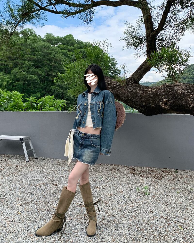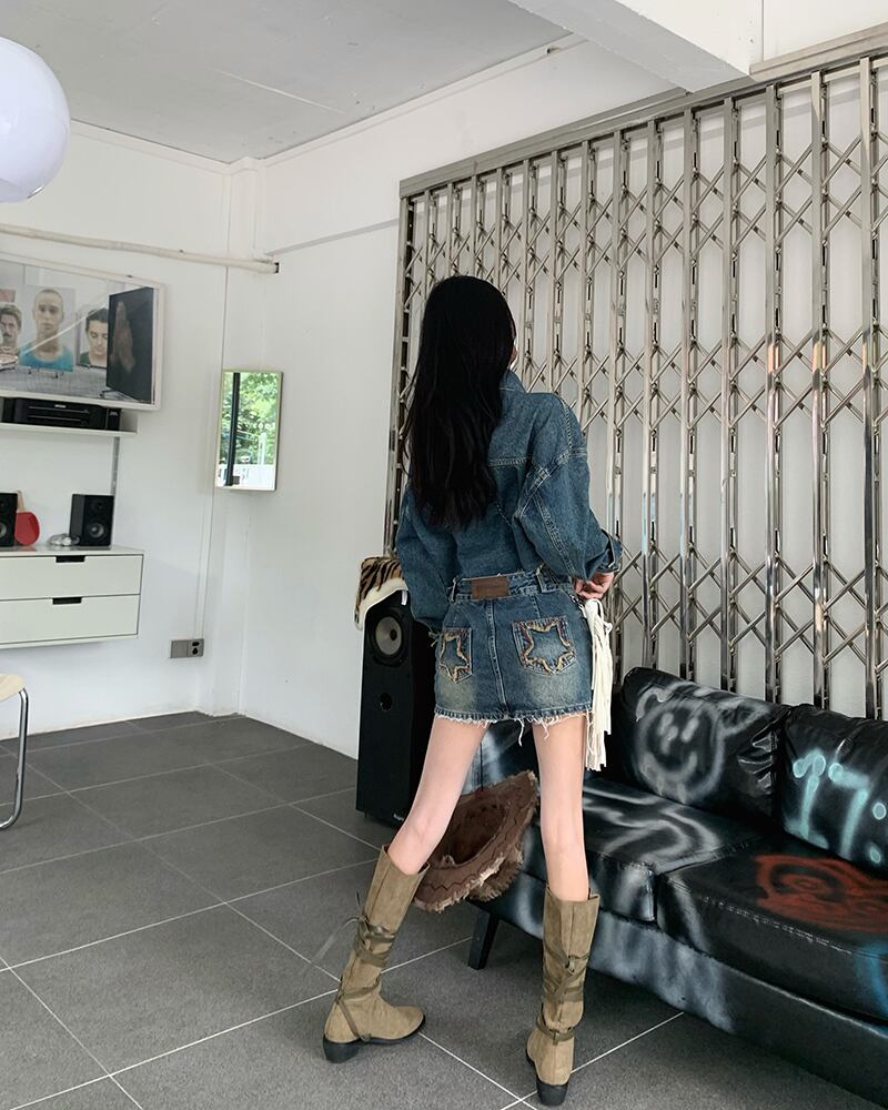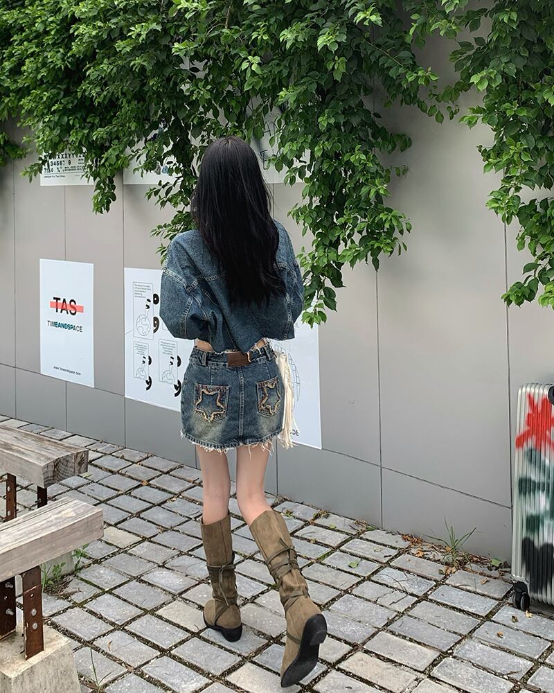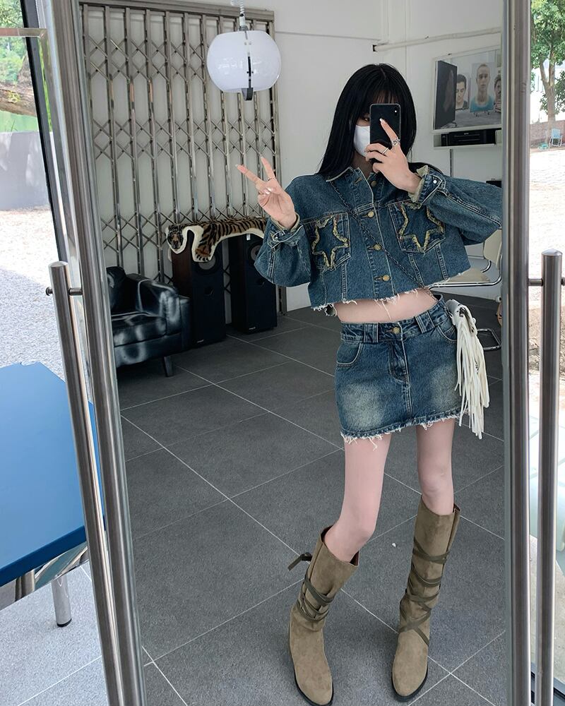 ホットガールスーツのレトロショートスターデニムジャケット春ヒップラップショートスカートツーピースセット服 スプリング 春物