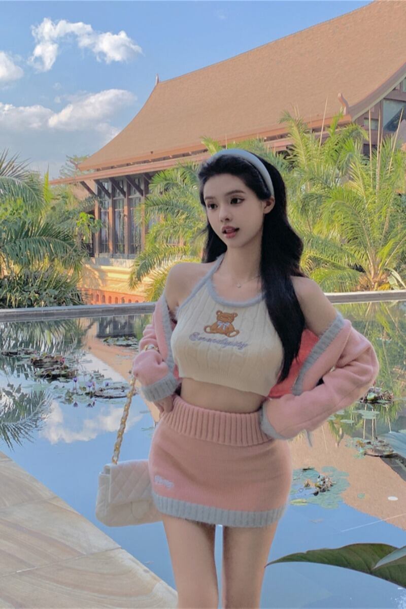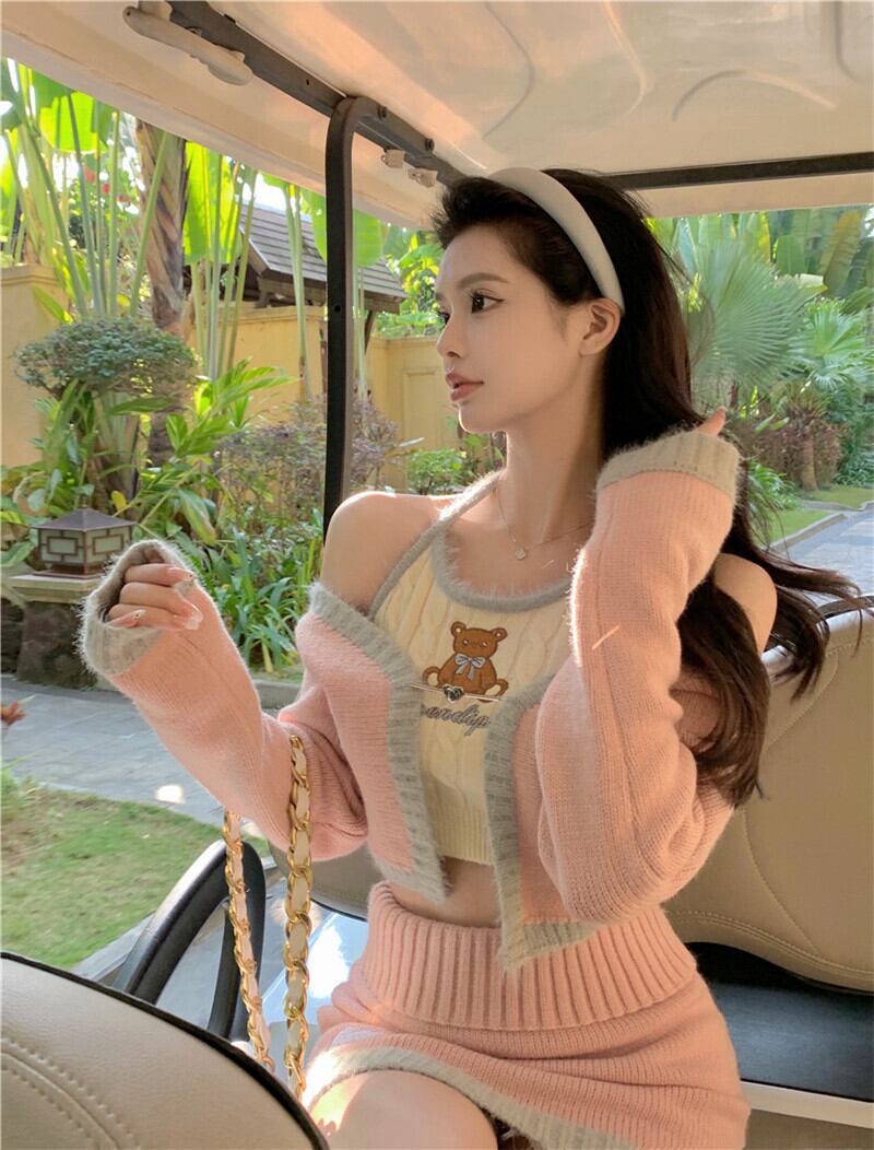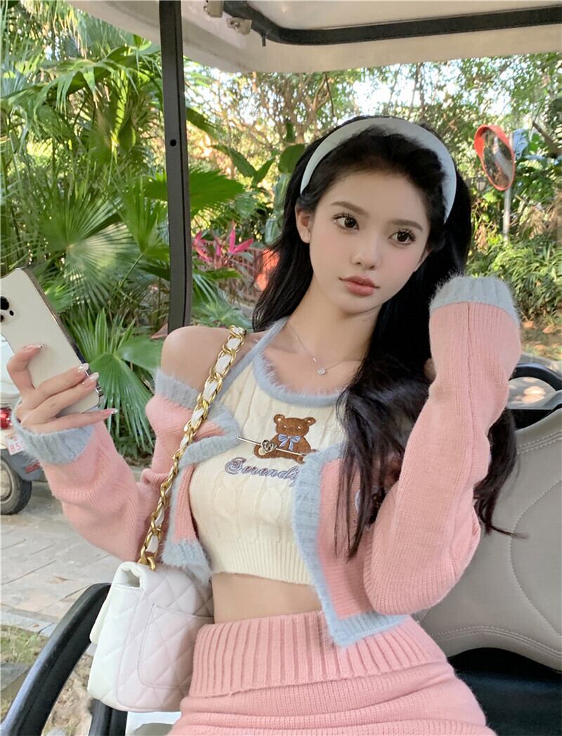 スウィートガールフレンチスタイルスーツのウエストかわいいクマプリントスプライスニットスリーピースセット服 大人ガーリー キュート カジュアル