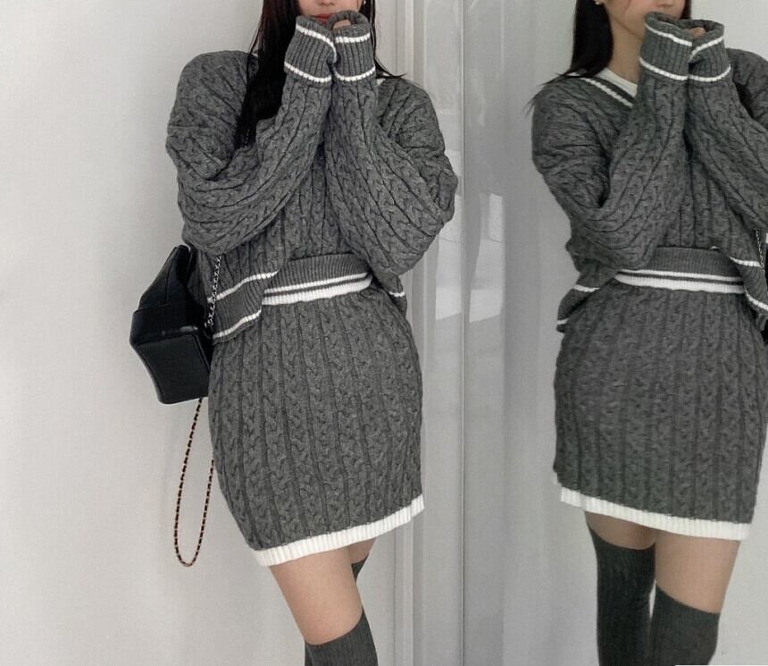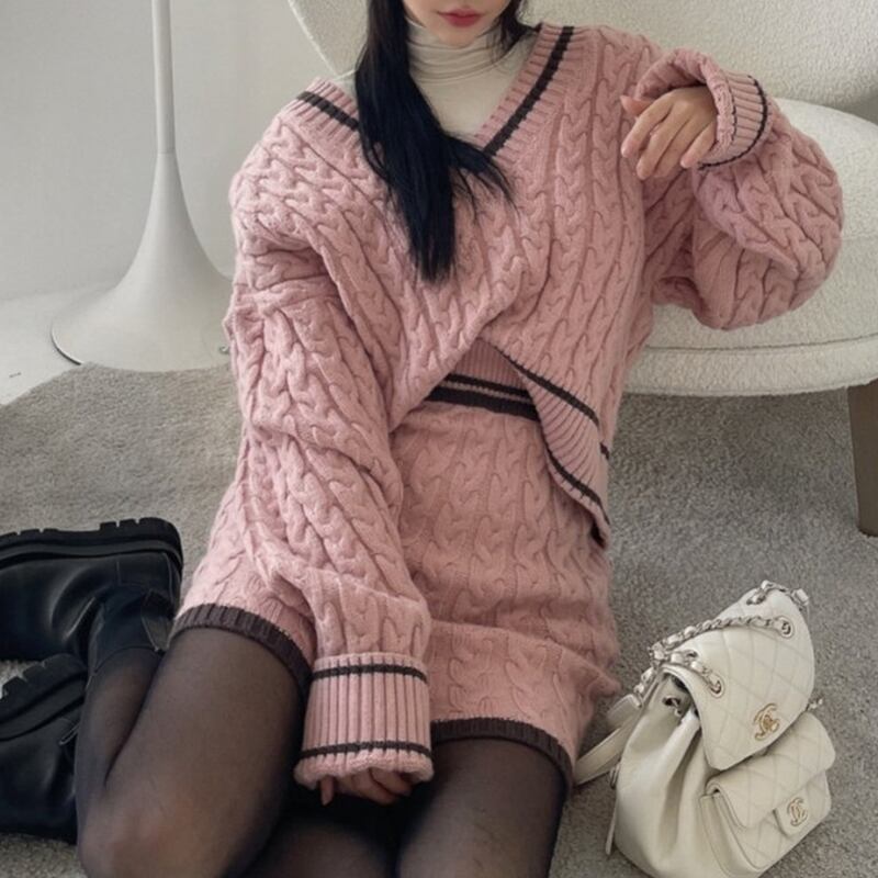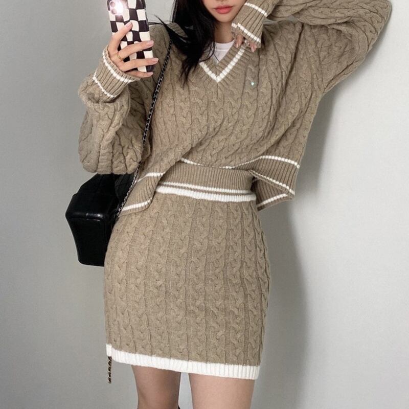 スタイルレトロスーツカラーコントラストVネック長袖ニットセーターウエストスリムラップヒップスカート2点セット ロング