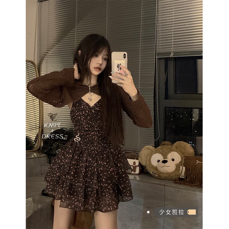 フリル花柄シフォンサスペンダードレス夏ホットガールウエストドレス Vestidos + ブラウス 2 点セット サマー 夏物