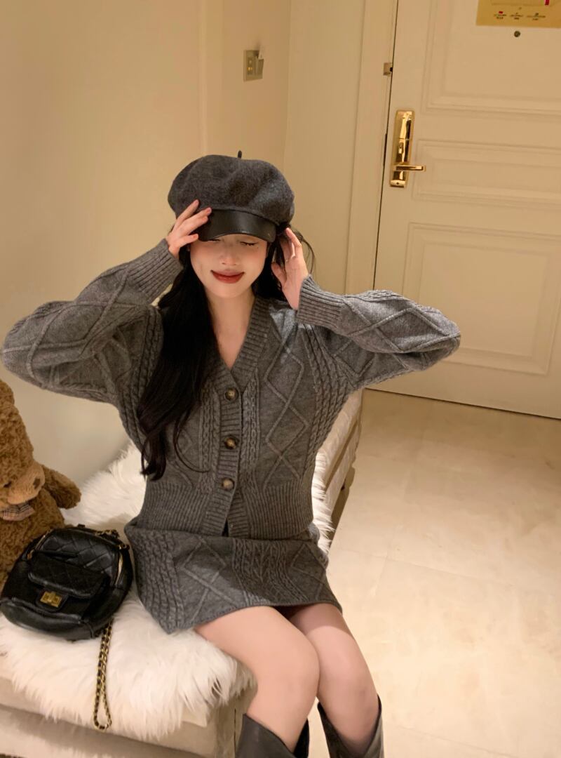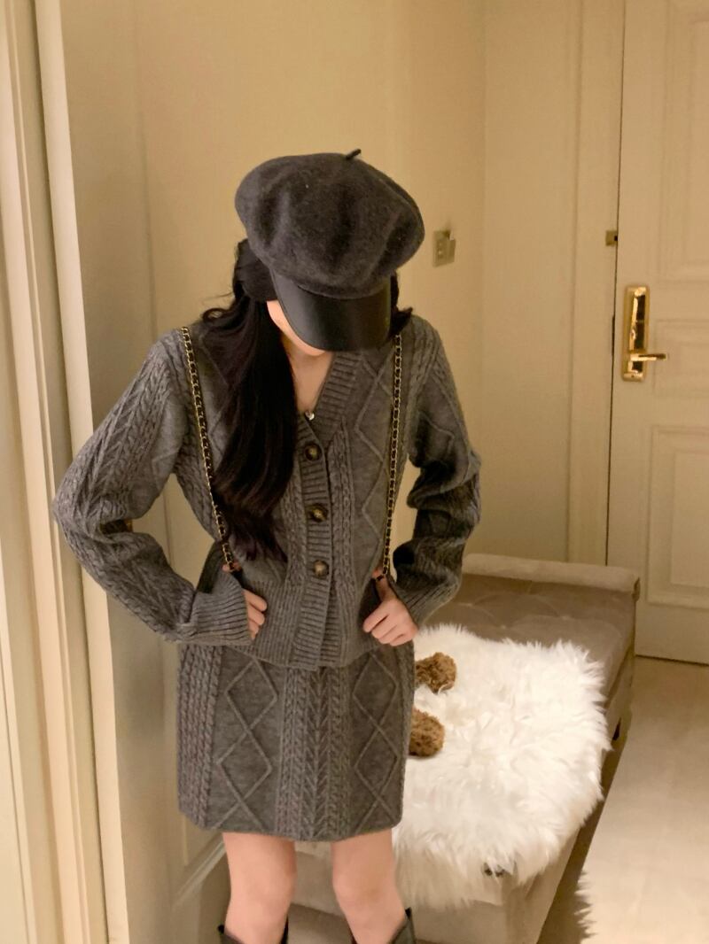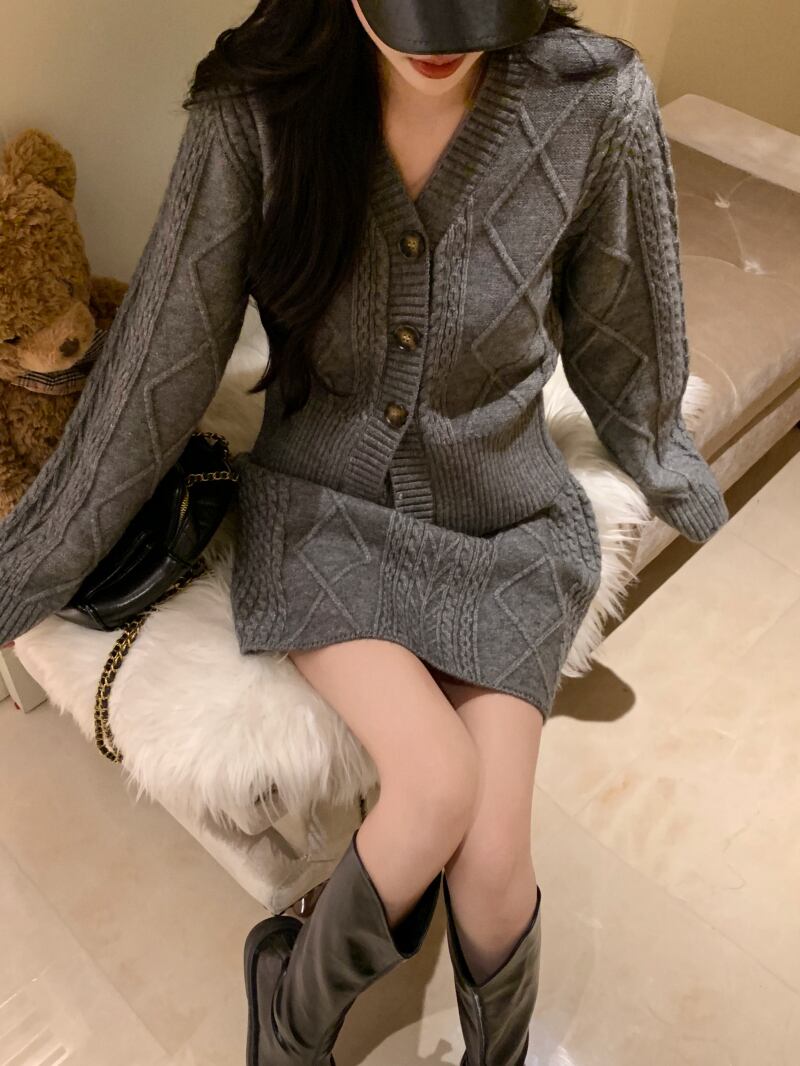 オフィスレディ ニットスーツ レディース グレー Vネック 長袖 ツイスト セーター カーディガン 冬 ウエスト ショートスカート 2点セット ロング ウィンター 冬物 会社 学校 通勤や通学にも