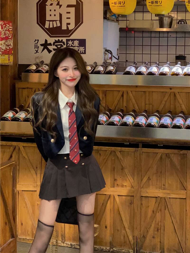 ベルベット風スーツ レディース 長袖 ショートスーツ コート 伸縮性プリーツスカート 白シャツとネクタイ3点セット ロング ホワイト エラスティック
