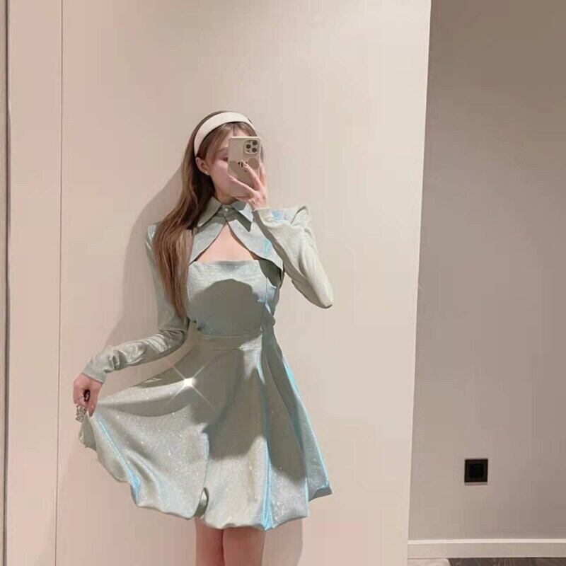 明るい気質シャツ襟ウエストバンドストラップレスサスペンダースカートウエストショースーツホットガールツーピースドレス シルク