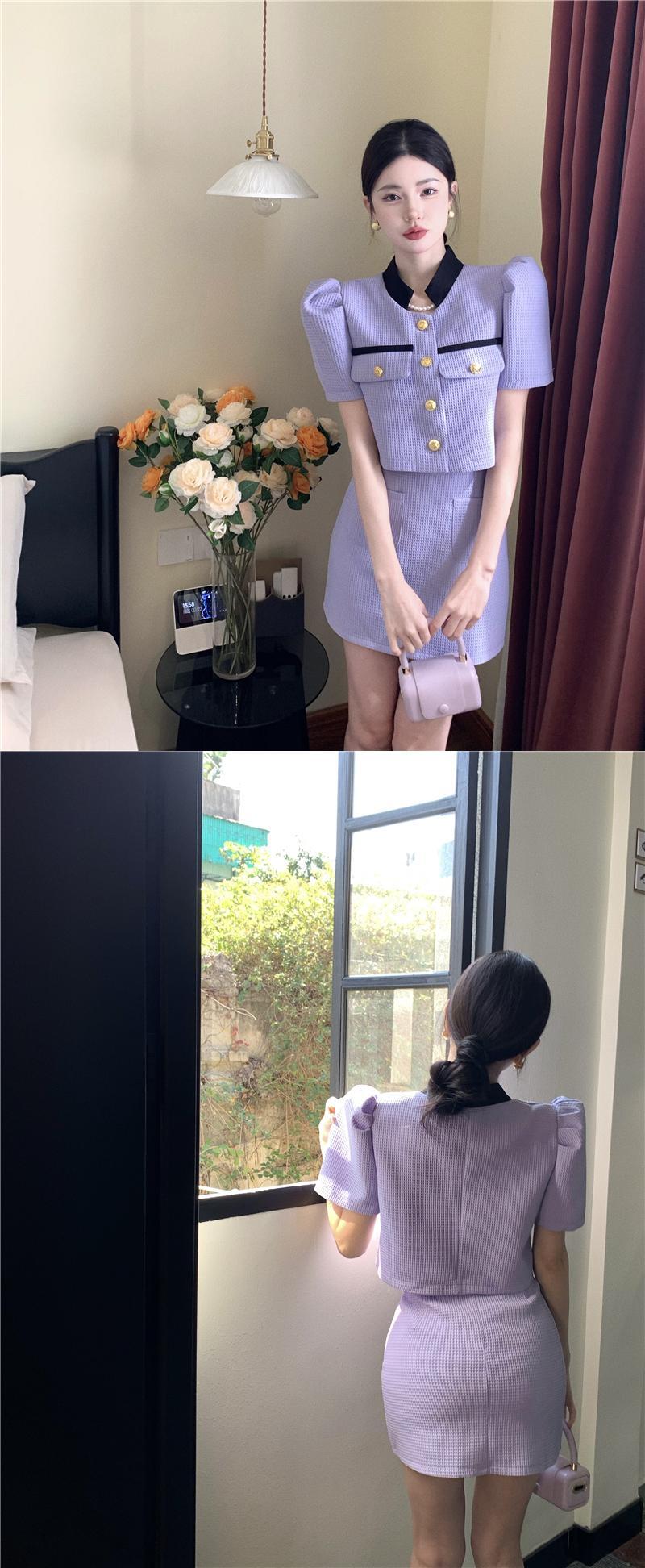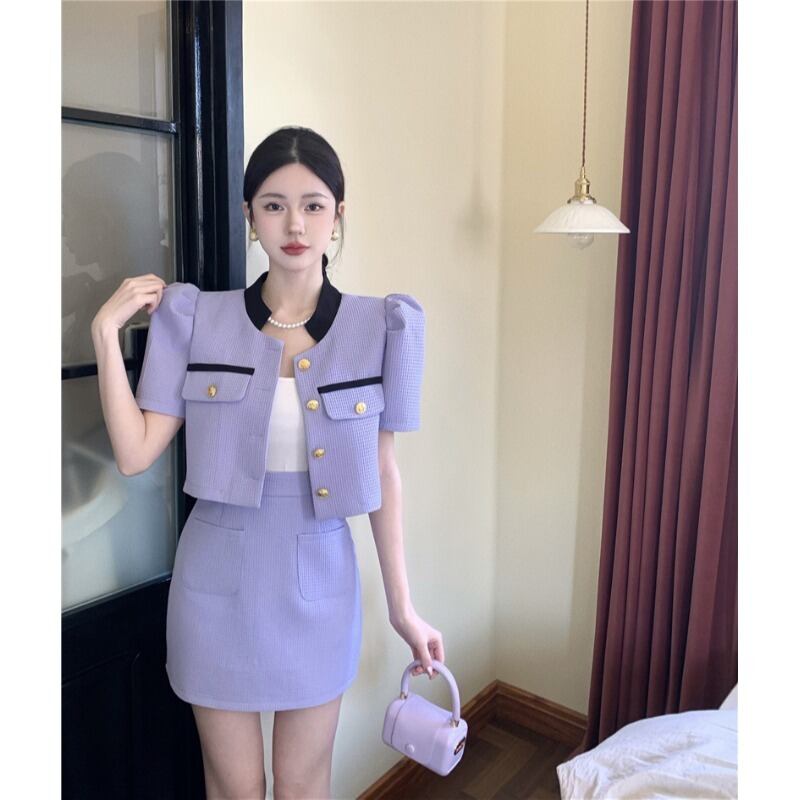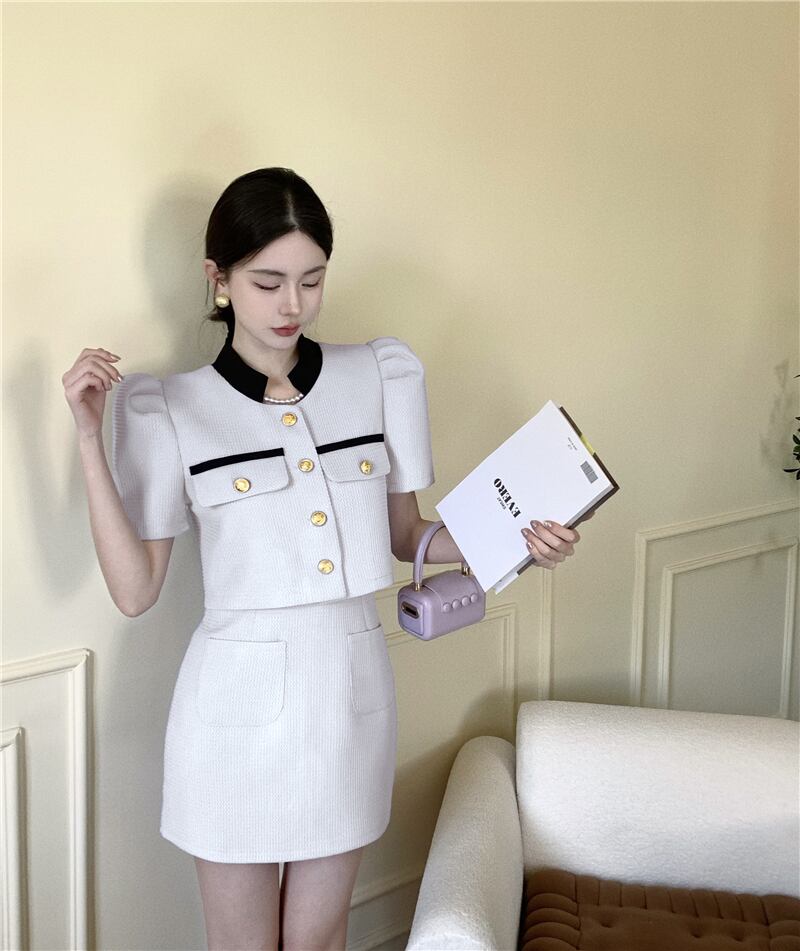 スウィートガール通勤スーツのパフスリーブスプライシングショートコートトップウエストスカート 2 点セット服 大人ガーリー キュート カジュアル