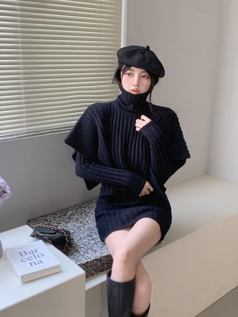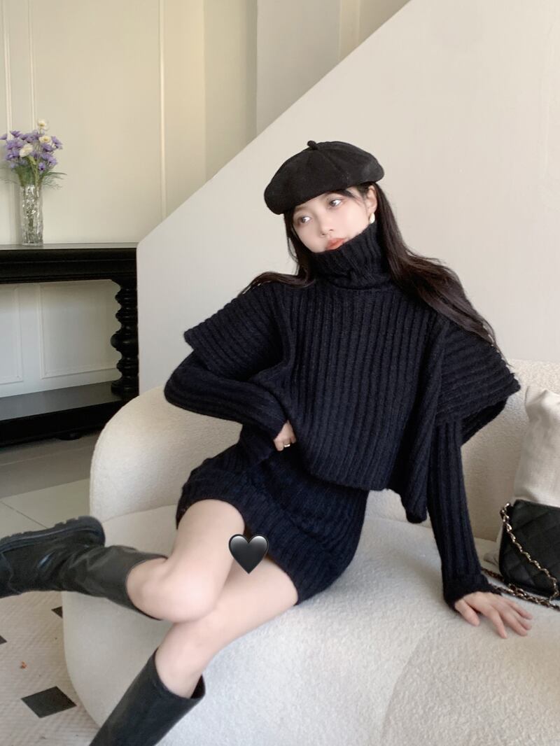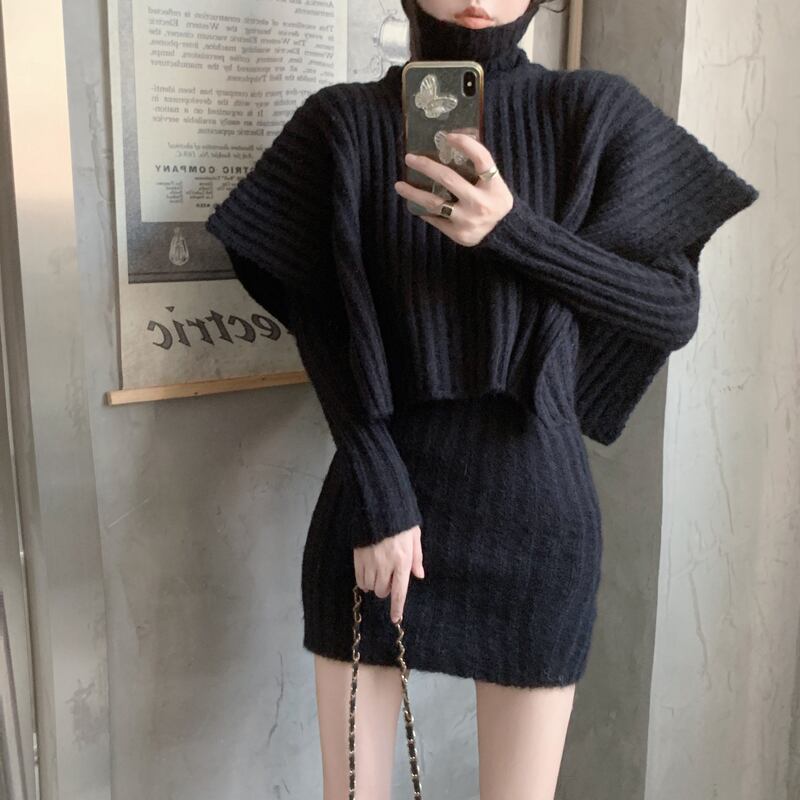 秋と冬の気質スーツ スリム ニット ドレスのネック セーター ショール 2 点セット服 オータム 秋物 ウィンター 冬物
