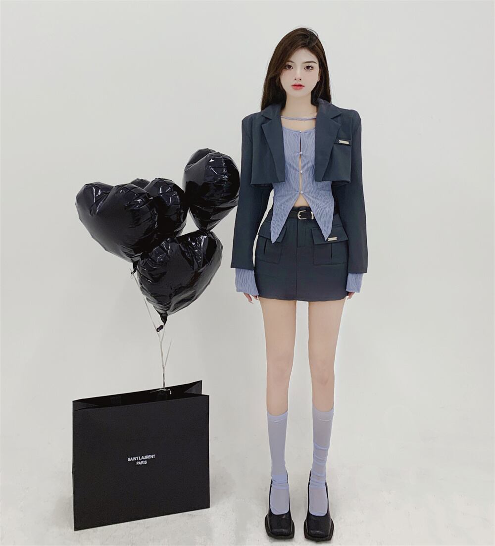 ホットガールスーツの春グレー長袖スモールスーツコートショートスカートブルーシャツ 3 点セット服 ロング スプリング 春物