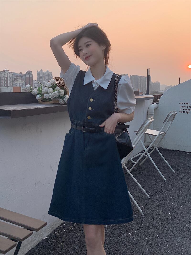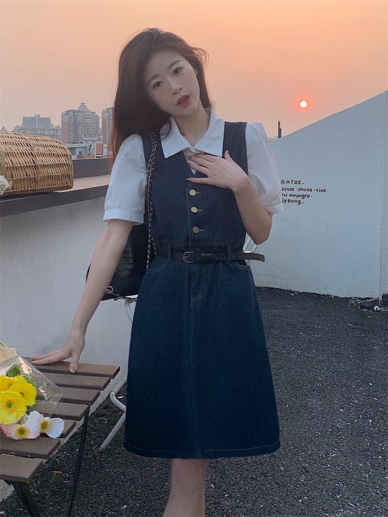 スウィート ガール スーツの デニム スリム ベスト ドレス ターン ダウン襟半袖白シャツ 2 点セット服 ホワイト 大人ガーリー キュート カジュアル