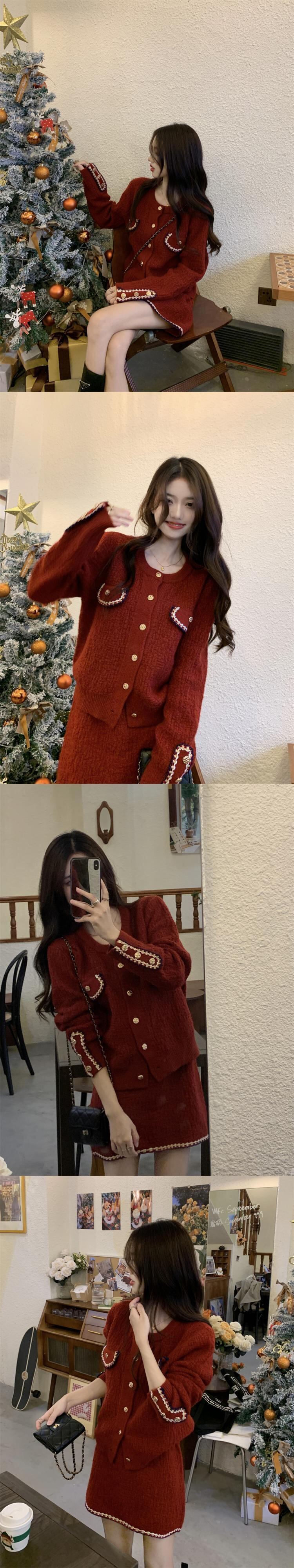 スウィートガールスーツレディースラウンドネック気質万能ニット冬ウエストスカートツーピースセット服 大人ガーリー キュート カジュアル ウィンター 冬物 Oネック