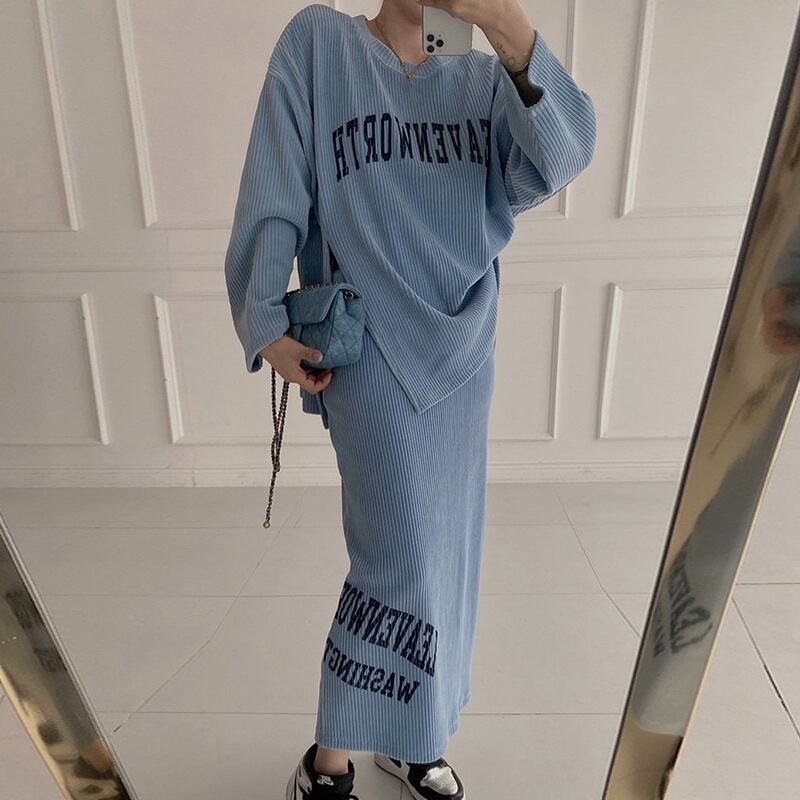 シックなスーツラウンドネックカラーコントラストレタースプリットセーターウエストスリムオーバーニーロングスカート2点セット服 Oネック