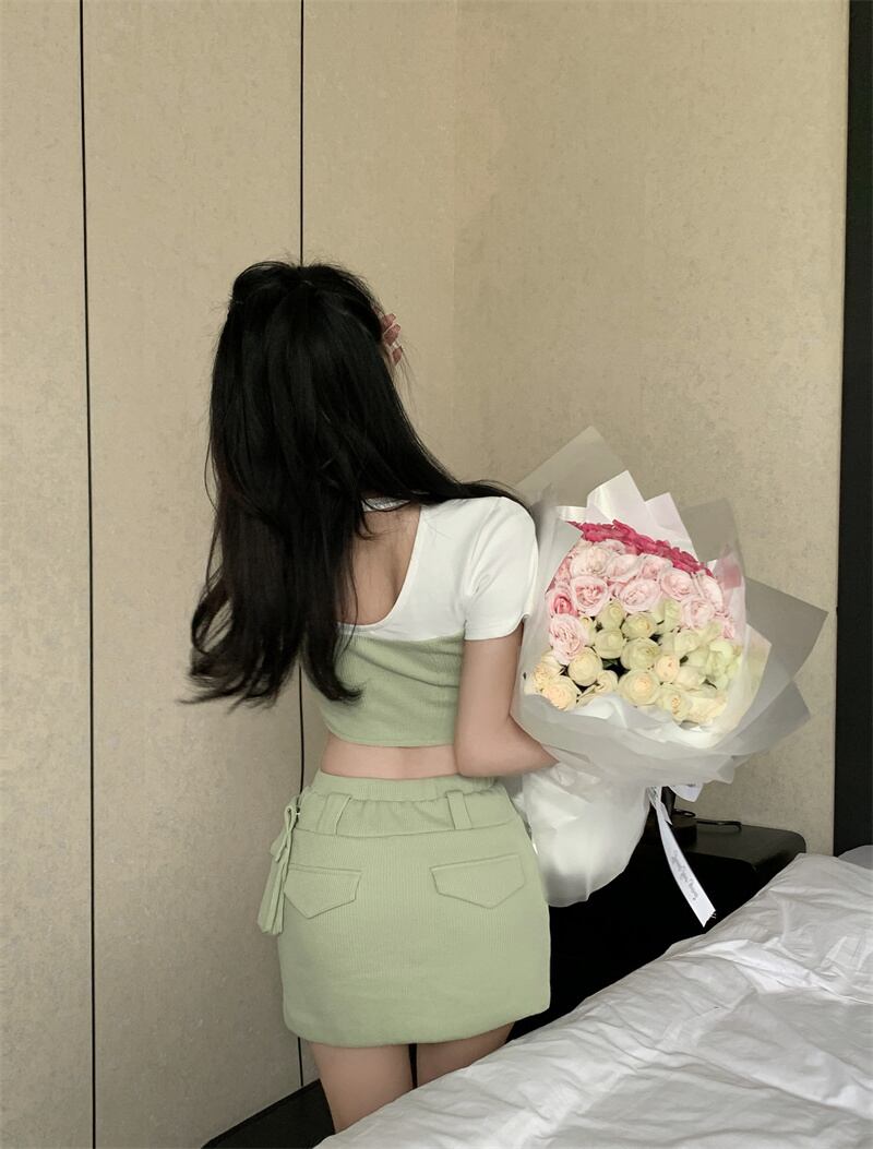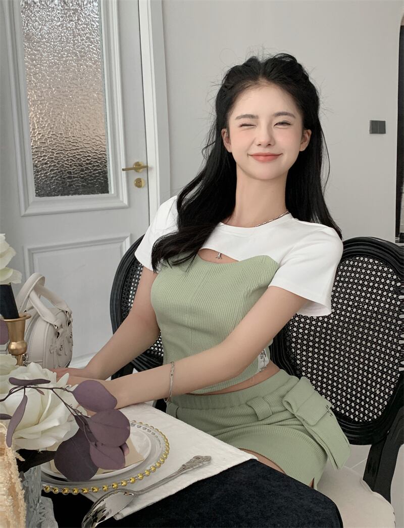 ホットガールスーツのワッフルカラーコントラストパッチワーク半袖 Tシャツトップウエストスリムスカート 2 点セット