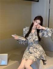 オフィスレディスーツ春と秋のセクシーなレトロなのインク花柄長袖 V ネックフリルウエストドレス 2 点セット ロング スプリング 春物 オータム 秋物 Vネック 会社 学校 通勤や通学にも