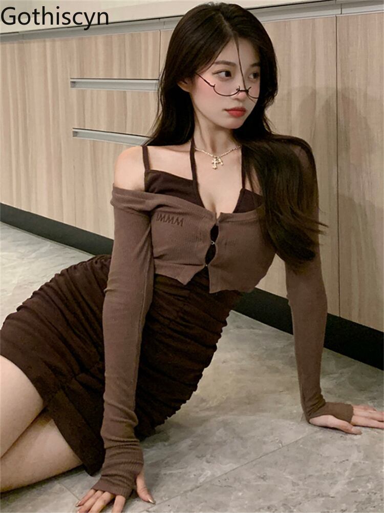 Gothiscyn スーツカーディガン + ベストドレス 2 点セットスキニーボタンアップセクシーなオフィスレディセットブラウンシックなストリートスーツ 会社 学校 通勤や通学にも