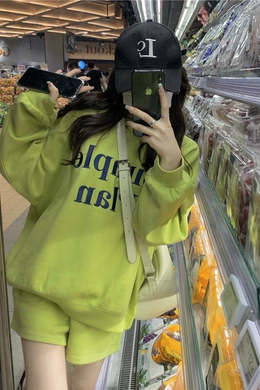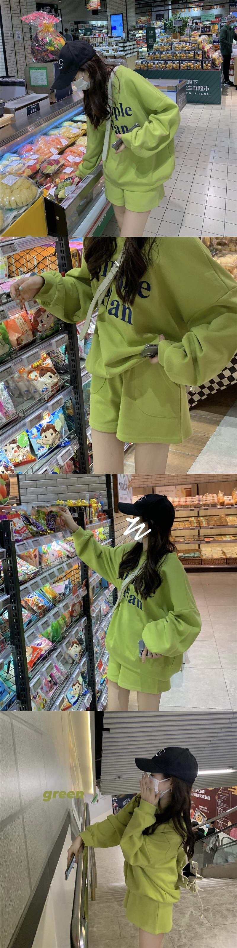 刺繍文字ルーズ長袖スウェットシャツ + ショーツ 2 点セット秋のスポーツスタイルのスーツ ロング レッド オータム 秋物 ブルマー