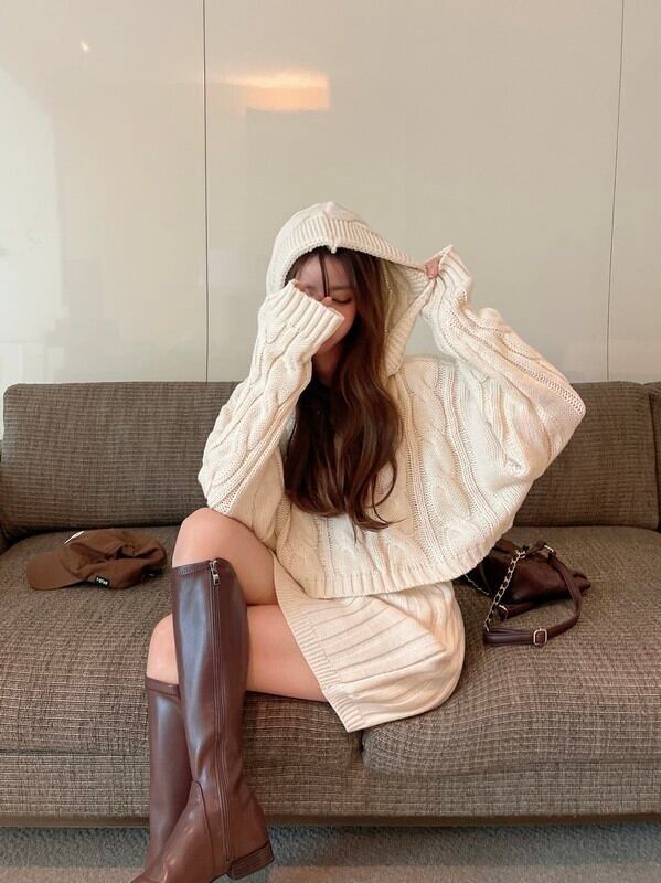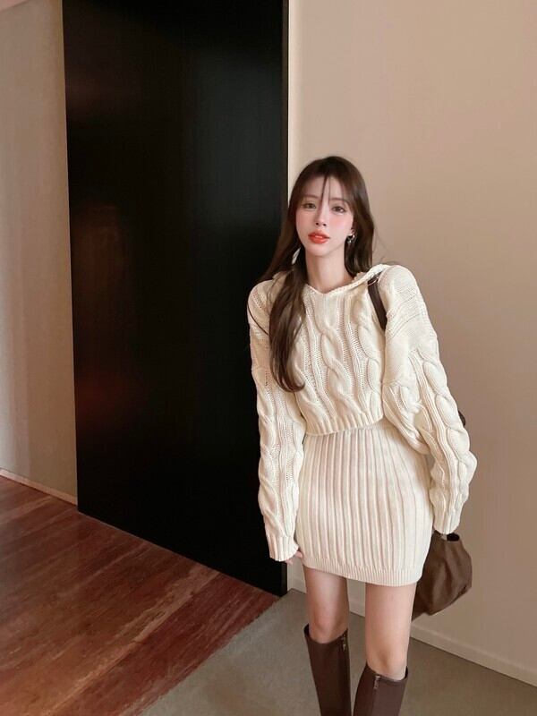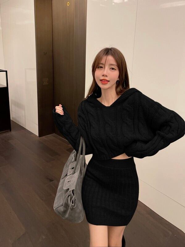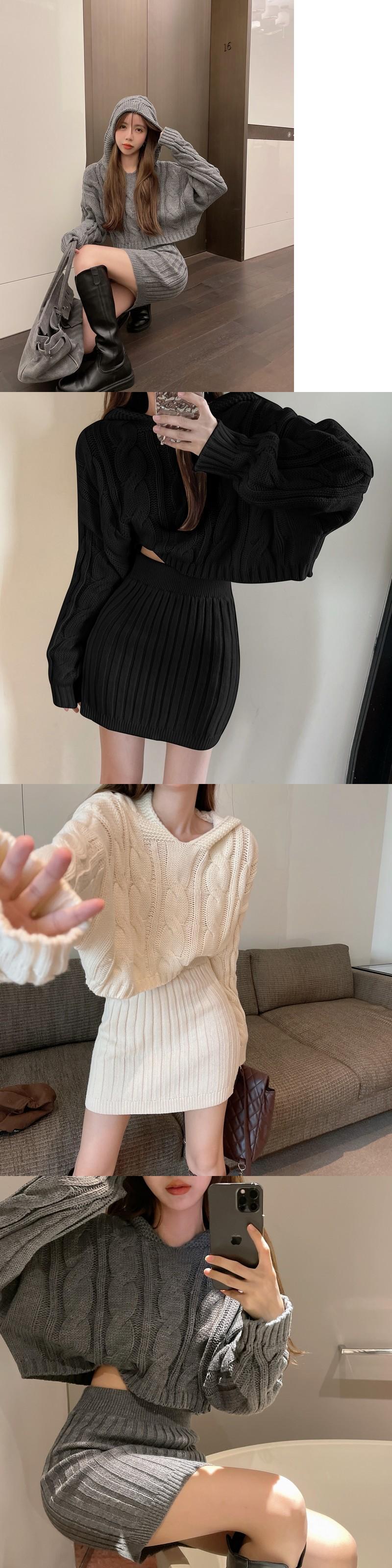 スウィートガールニットスーツのツイストフレンチスタイルの冬のフード付きセーターウエストヒップラップスカート 2 点セット 大人ガーリー キュート カジュアル ウィンター 冬物