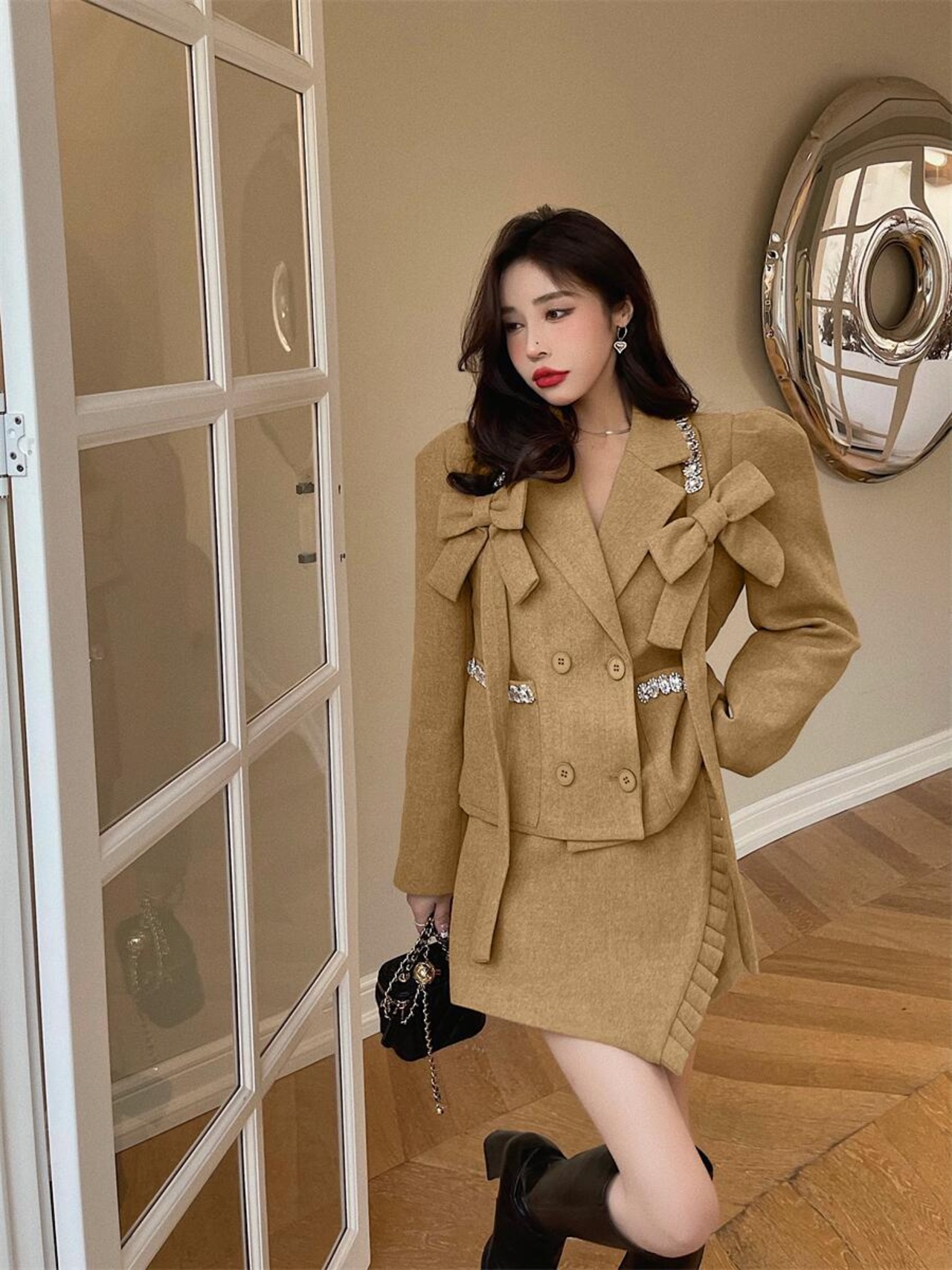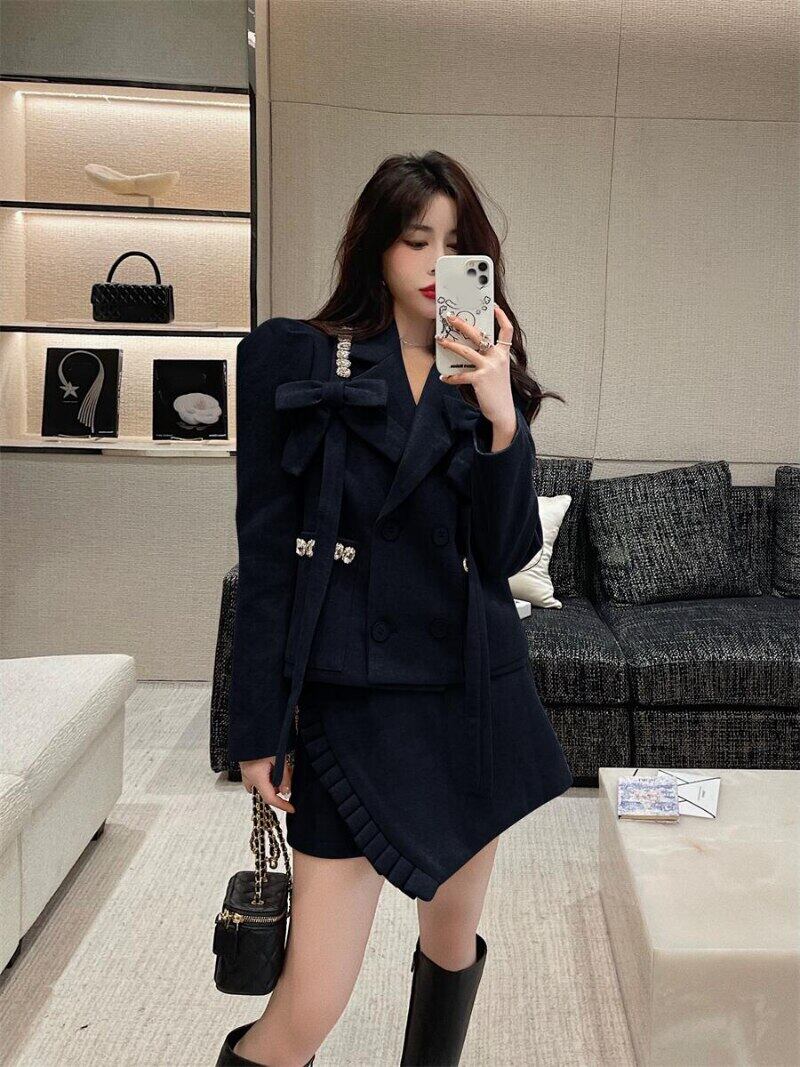 通勤 ストリート スーツ レディース 冬 蝶結び 象嵌 ダイヤリボン ウールスーツ コート イレギュラー スカート ショーツ 2点セット ウィンター 冬物 ブルマー