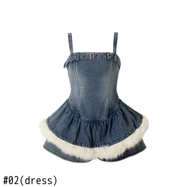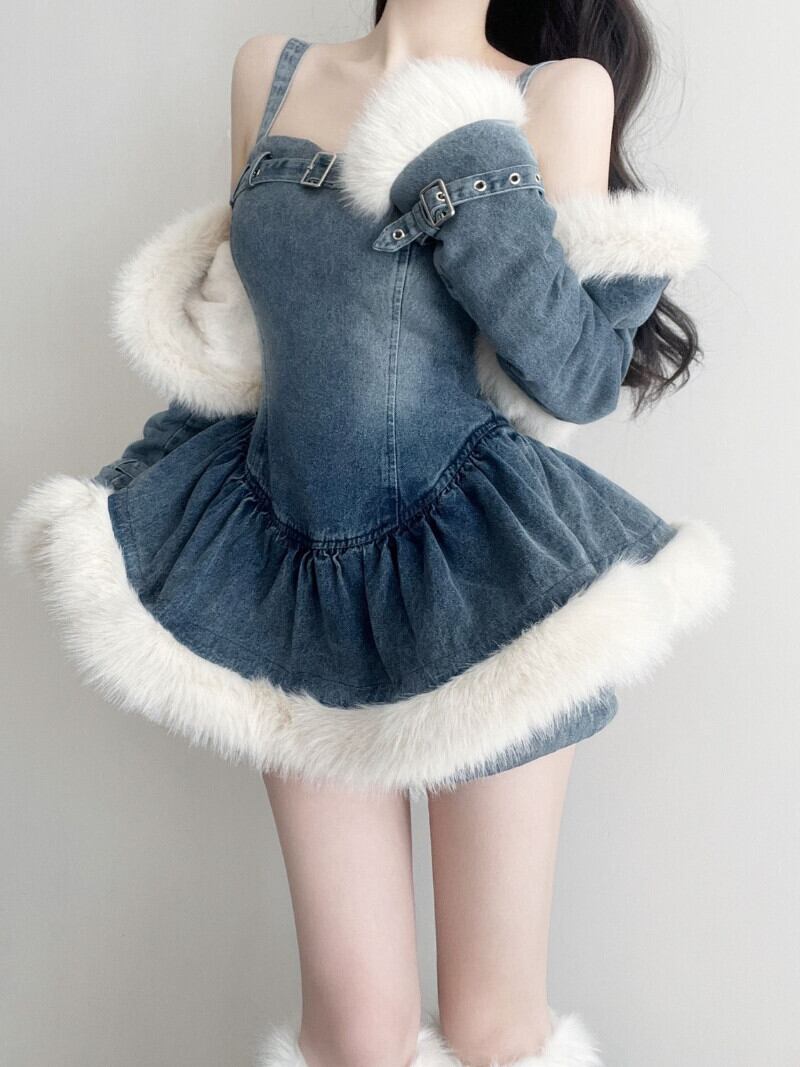 香港スタイルホットガールスーツのウールの襟デニムジャケットふくらんドレス秋肥厚暖かいツーピースセット オータム 秋物