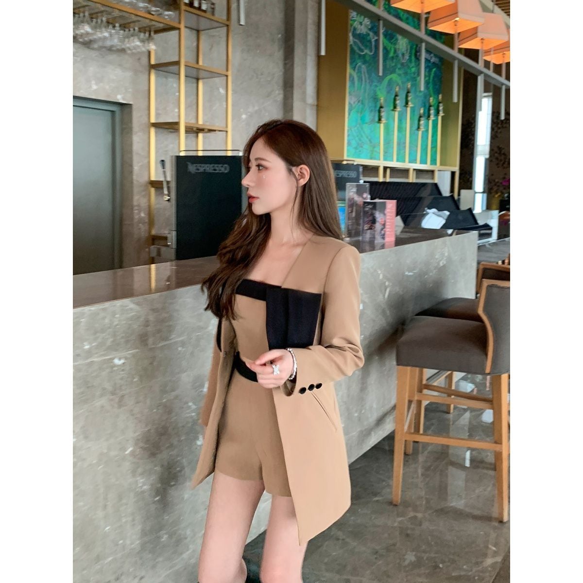 通勤のセット中空カーキ スーツ コート春夏キャミソール ショーツ エンド オフィス レディ 3 点セット服 スプリング 春物 サマー 夏物 ブルマー 会社 学校 通勤や通学にも